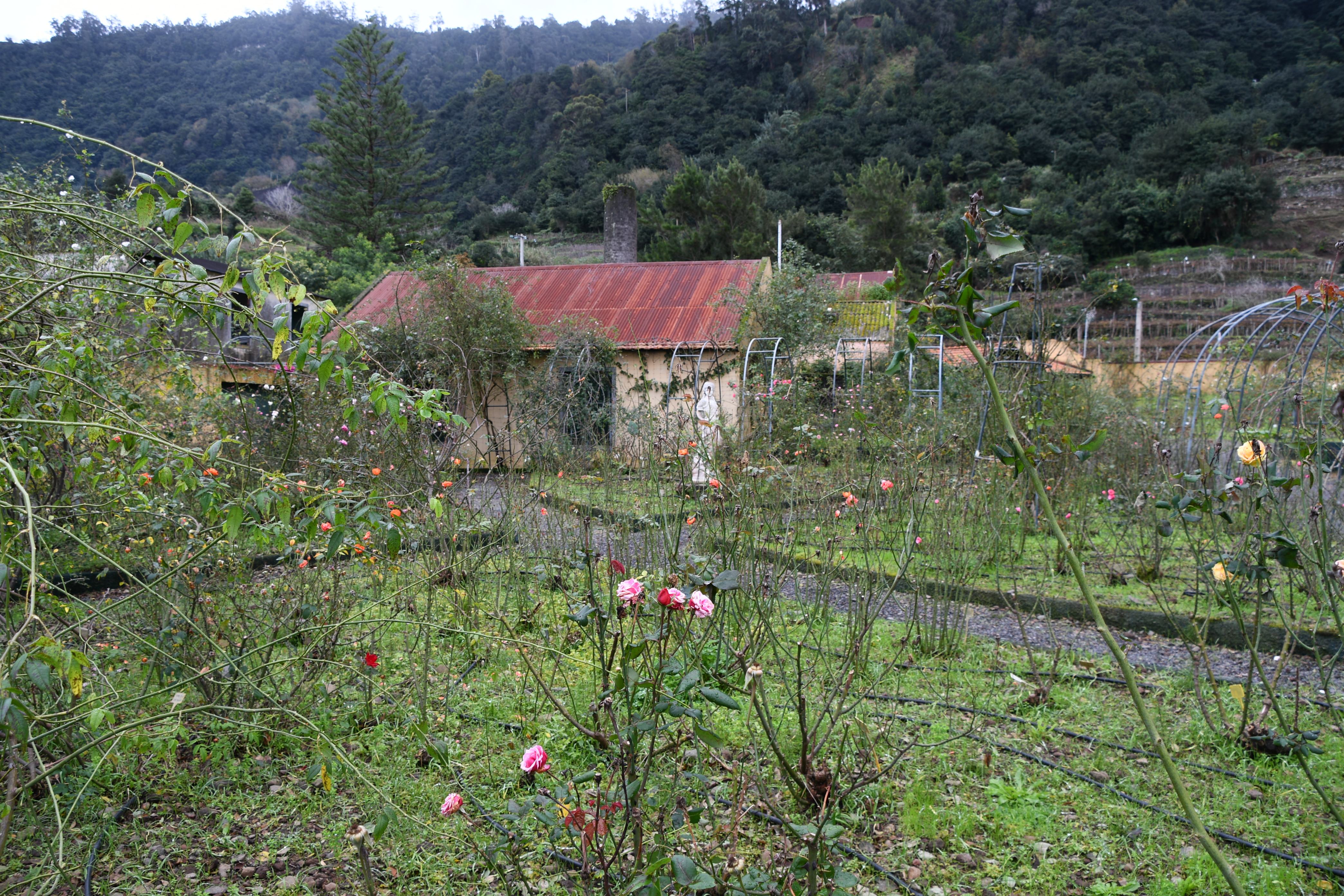 Auf dem Weg nach Sao Vicente fahre ich in Arco San Jorge an einem Gebäude vorbei, auf dem „Rosario“ steht. Irgendwie will ich wissen, was dahinter steckt. Also: Auto abstellen und mit Kamera bewaffnet durch die Pforte. Es stellt sich heraus, dass es sich dabei um einen weitläufigen Komplex mit lauter kleinen Häuschen handelt, die man mieten kann. Im hinteren Teil ist ein riesiger Rosengarten. Auch wenn jetzt gerade keine Blühzeit ist und die Stauden ein wenig verwildert wirken, bin ich sehr beeindruckt von den vielen verschiedenen Sorten und mache ein paar Bilder.