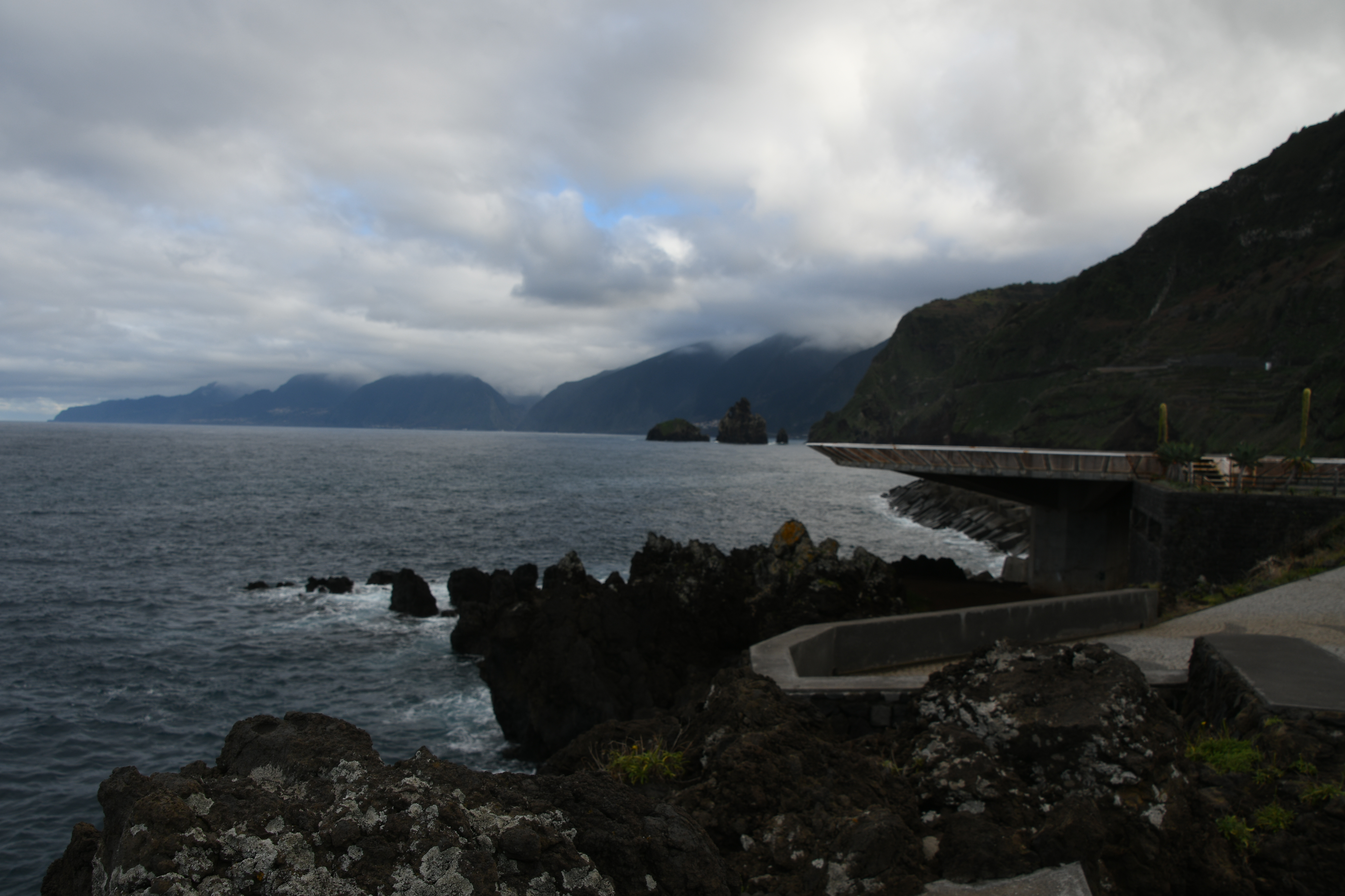 Weiter geht’s nach Sao Vicente, wo es Zeit wird, etwas zu futtern und zu trinken. Ein warmer Toast mit Tomaten und Käse kommt da grad recht – und dann geht’s auf zum letzten Ziel Porto Moniz. Das ist cool: Becken von ruhigem Wasser direkt neben dem tosenden Meer. Das ganze eingebettet in Lawagestein, teilweise bewachsen mit interessanten Pflanzen. Sogar heute (bei windigen 14 °) gibt es einige, die sich ausziehen und ein Bad in den Becken nehmen. Da friert es mich schon beim Hinschauen… Ich glaube, ich hole mir lieber einen warmen Kaffee – und dann mache ich mich auf den Rückweg. Dank meiner Bluetooth Verbindung für die Musik habe ich plötzlich wenigstens den Ton meines Navis über die Auto-Anlage. Ist doch schon ein Fortschritt !!