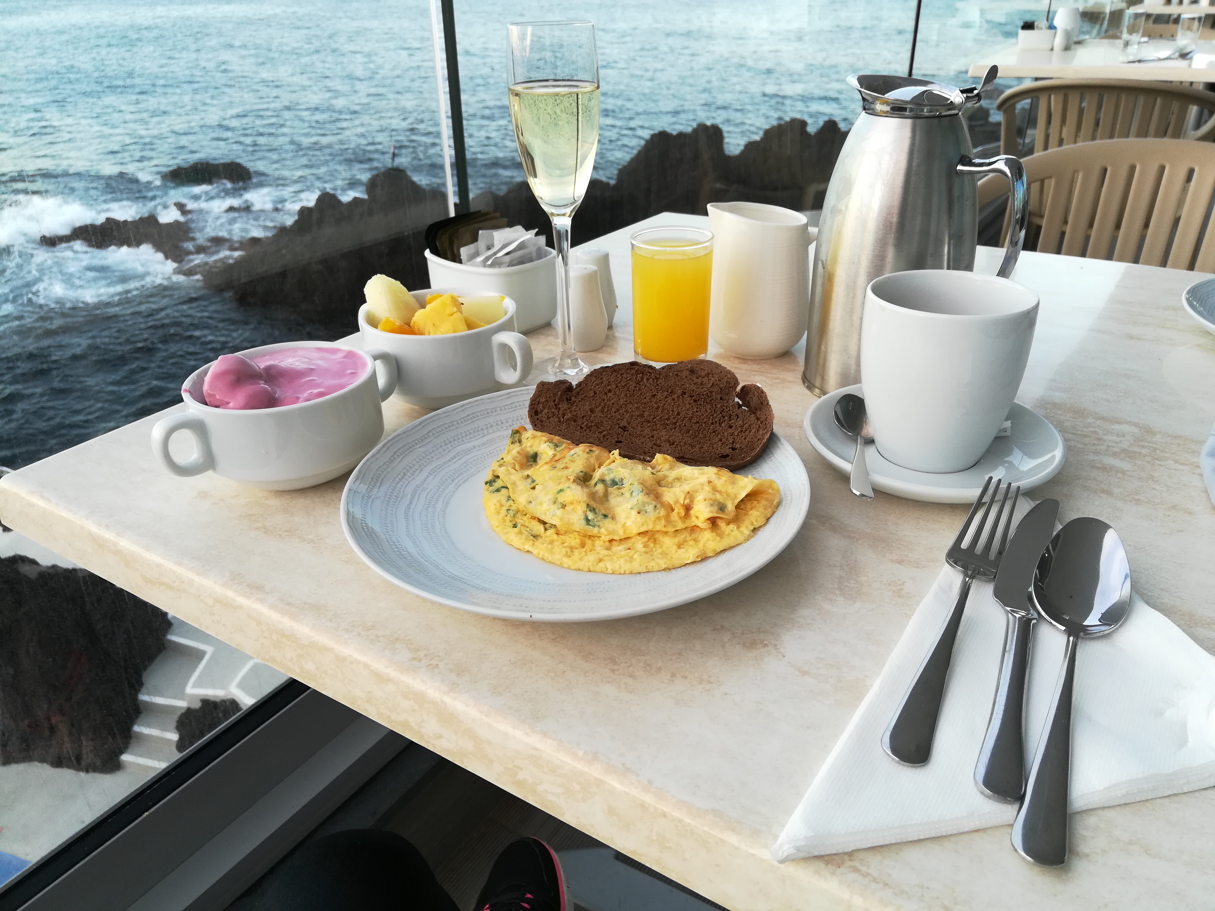 Und das lassen wir wieder ganz gemütlich angehen: mit unserem Frühstück im Atlantis (heute sogar mit Sektchen zur Begrüßung) und Sonnenaufgangsstimmung. Wieder ist es anfangs frisch, aber wenn die Sonne mal da ist, wird es schön warm.