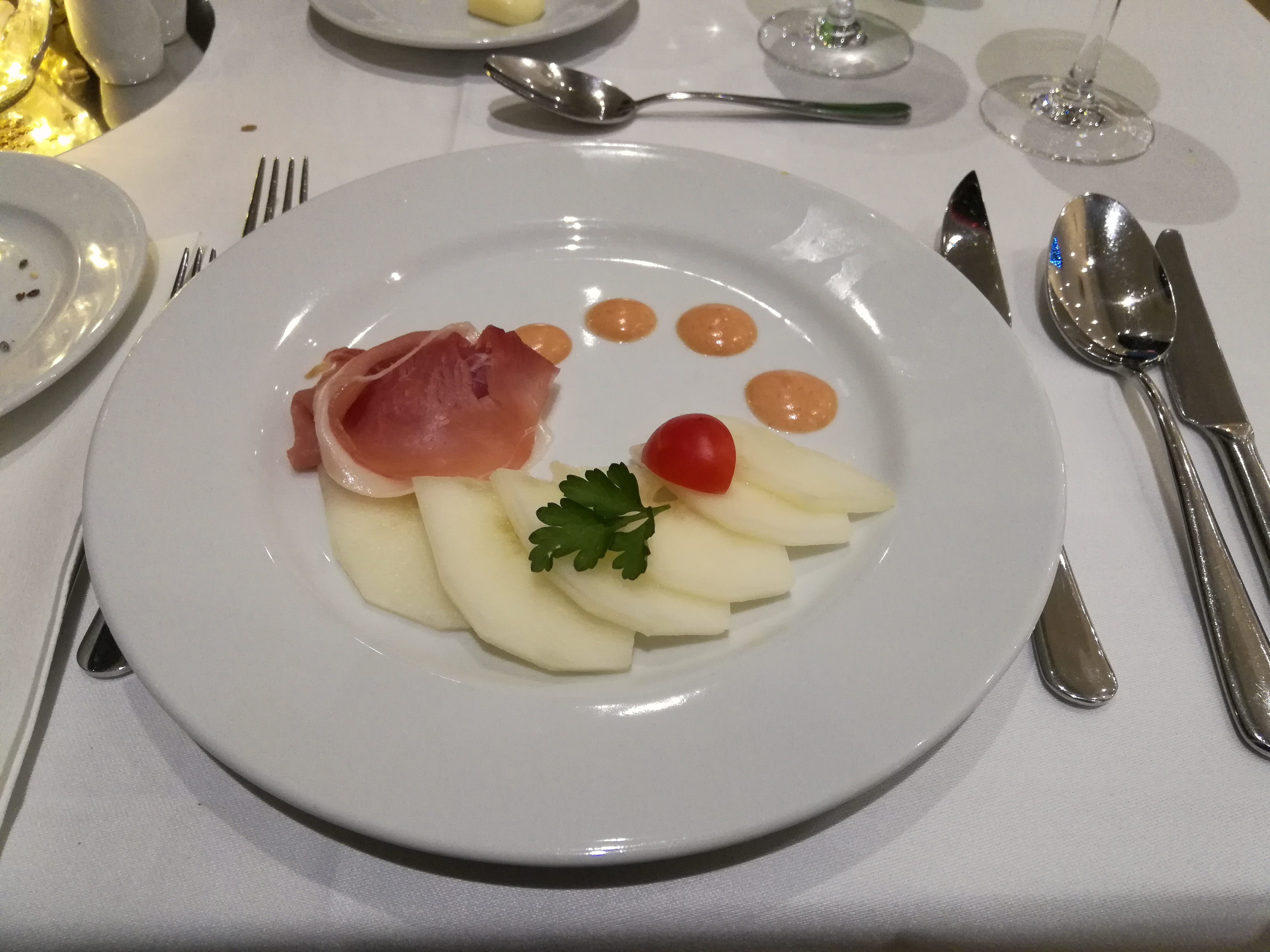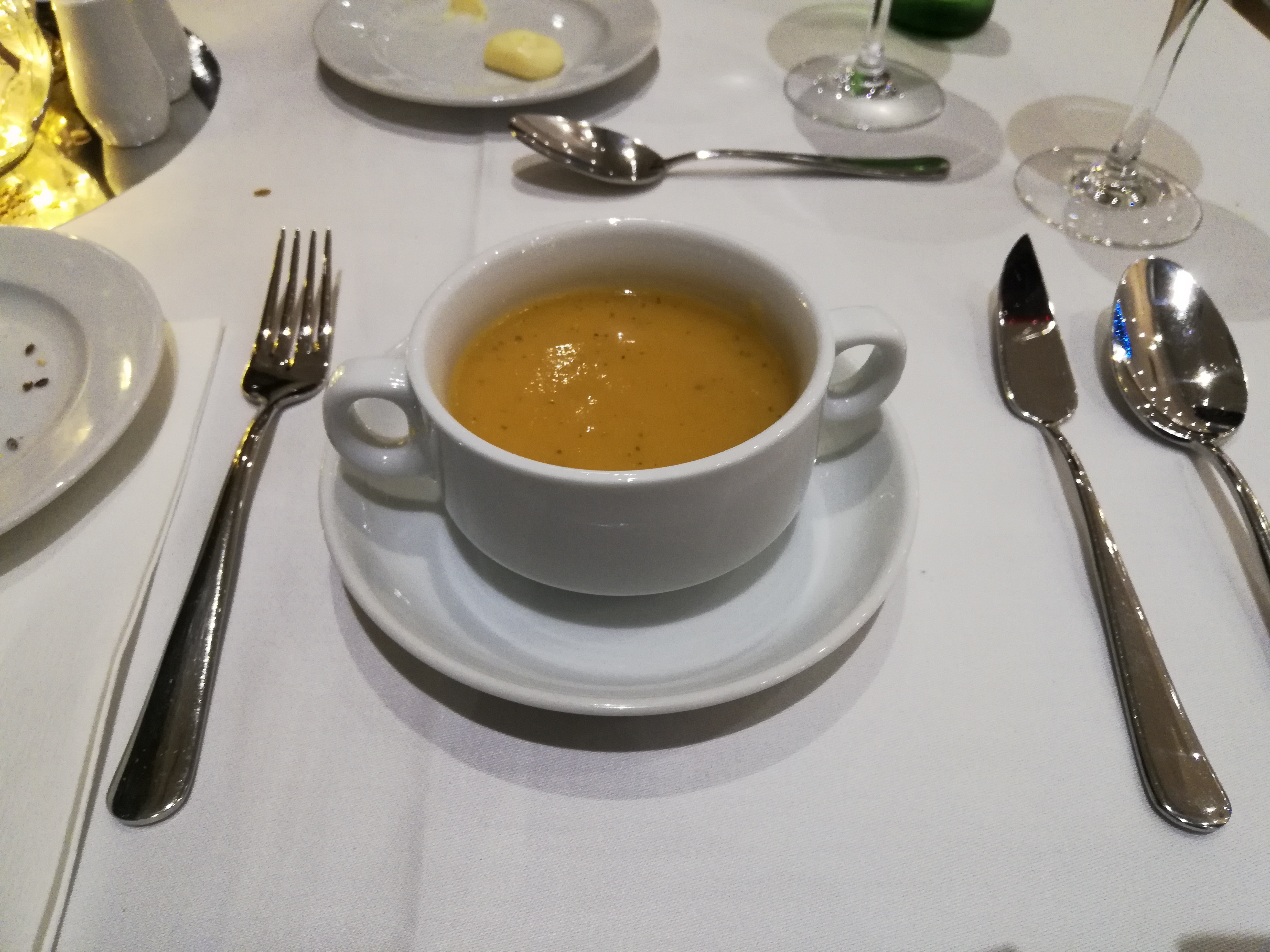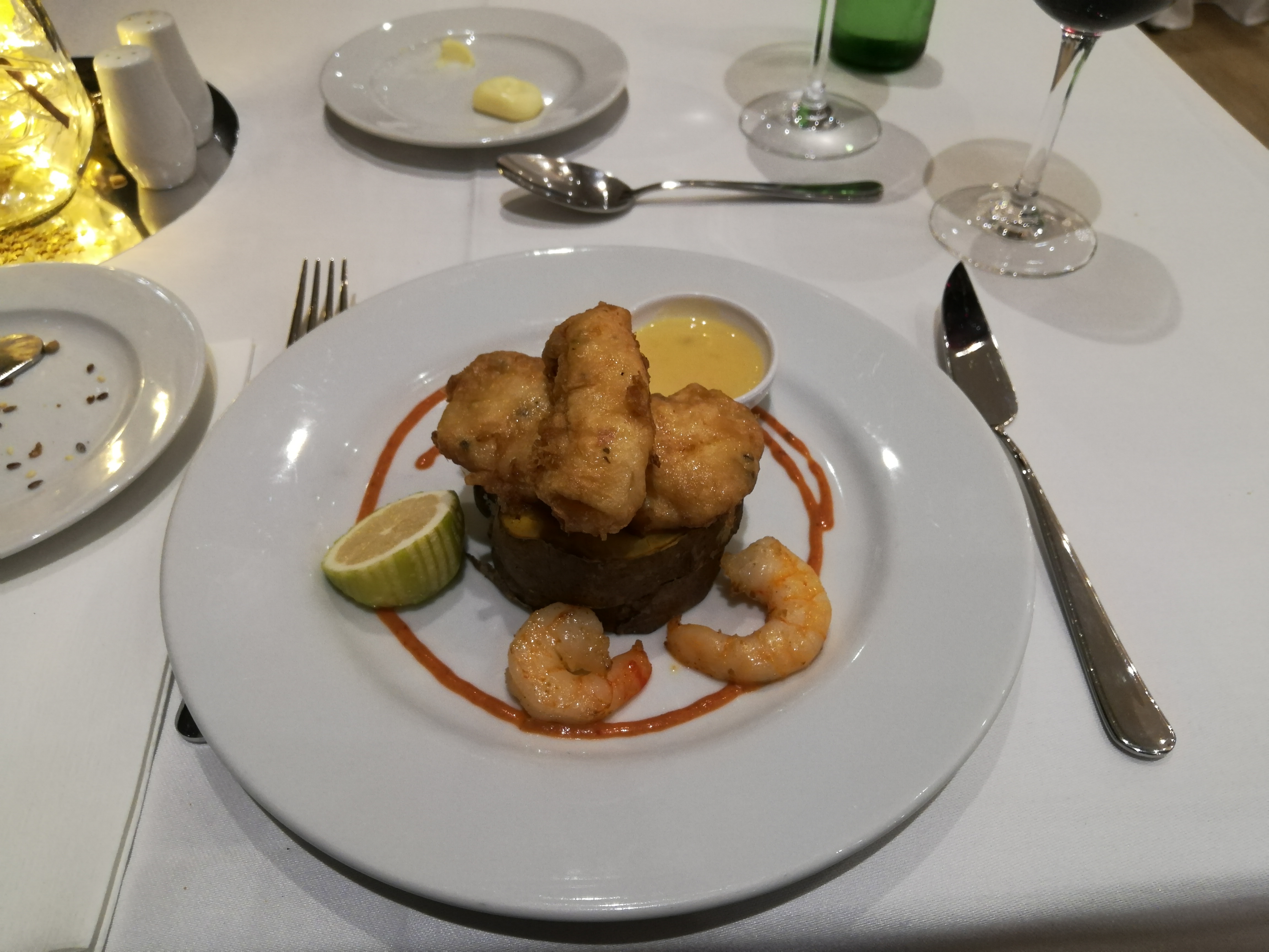 Das bedeutet, dass ich mich noch etwas ausruhen kann, bevor es um 20 Uhr zum Abendessen geht. Ich suche mir denselben Platz aus wie gestern und auch heute ist das 4-Gänge Menü wieder sehr lecker mit Vorspeise, Suppe, Fisch und Dessert. Gute Idee, während dieses Urlaubs Halbpension zu nehmen…