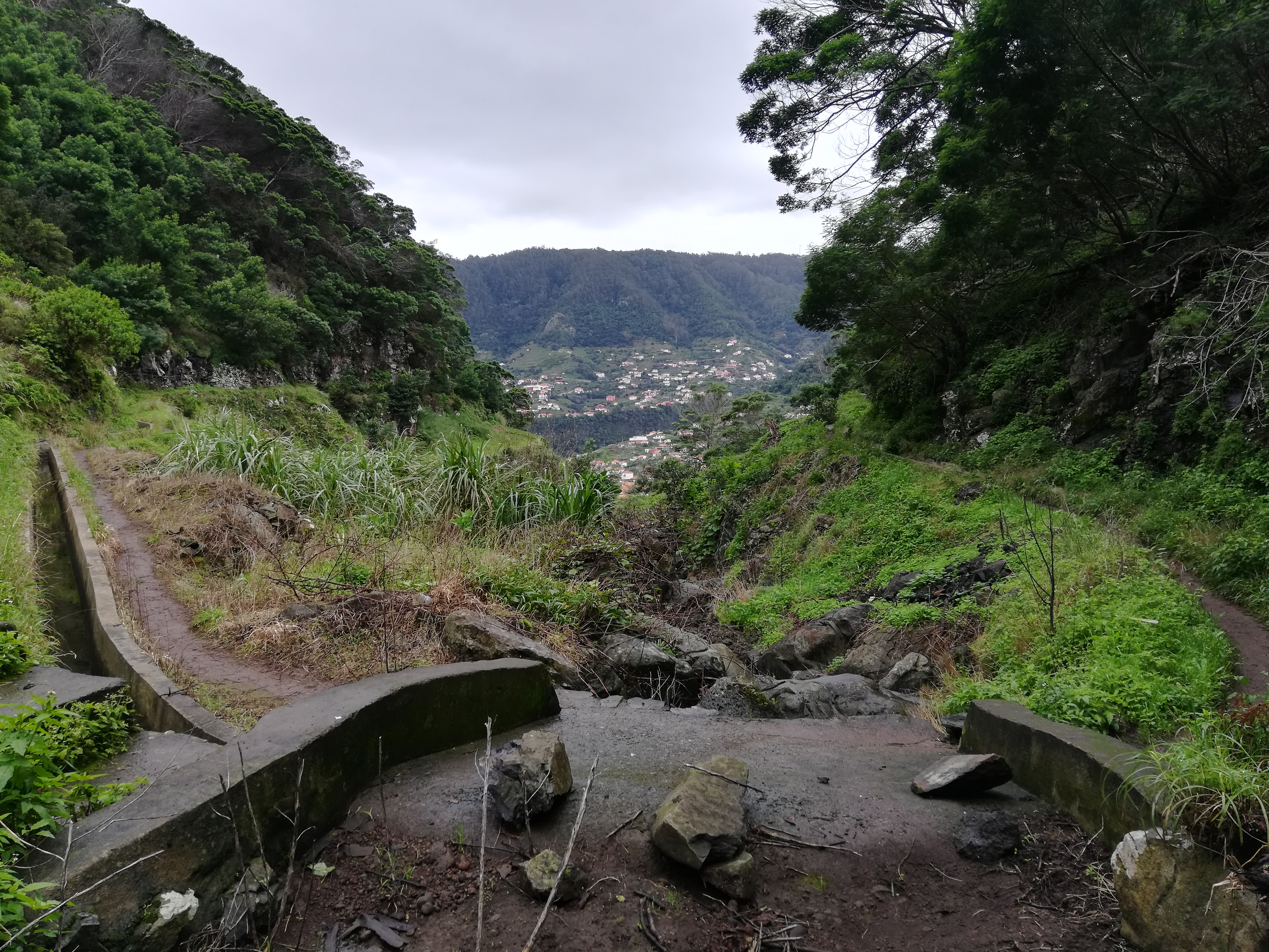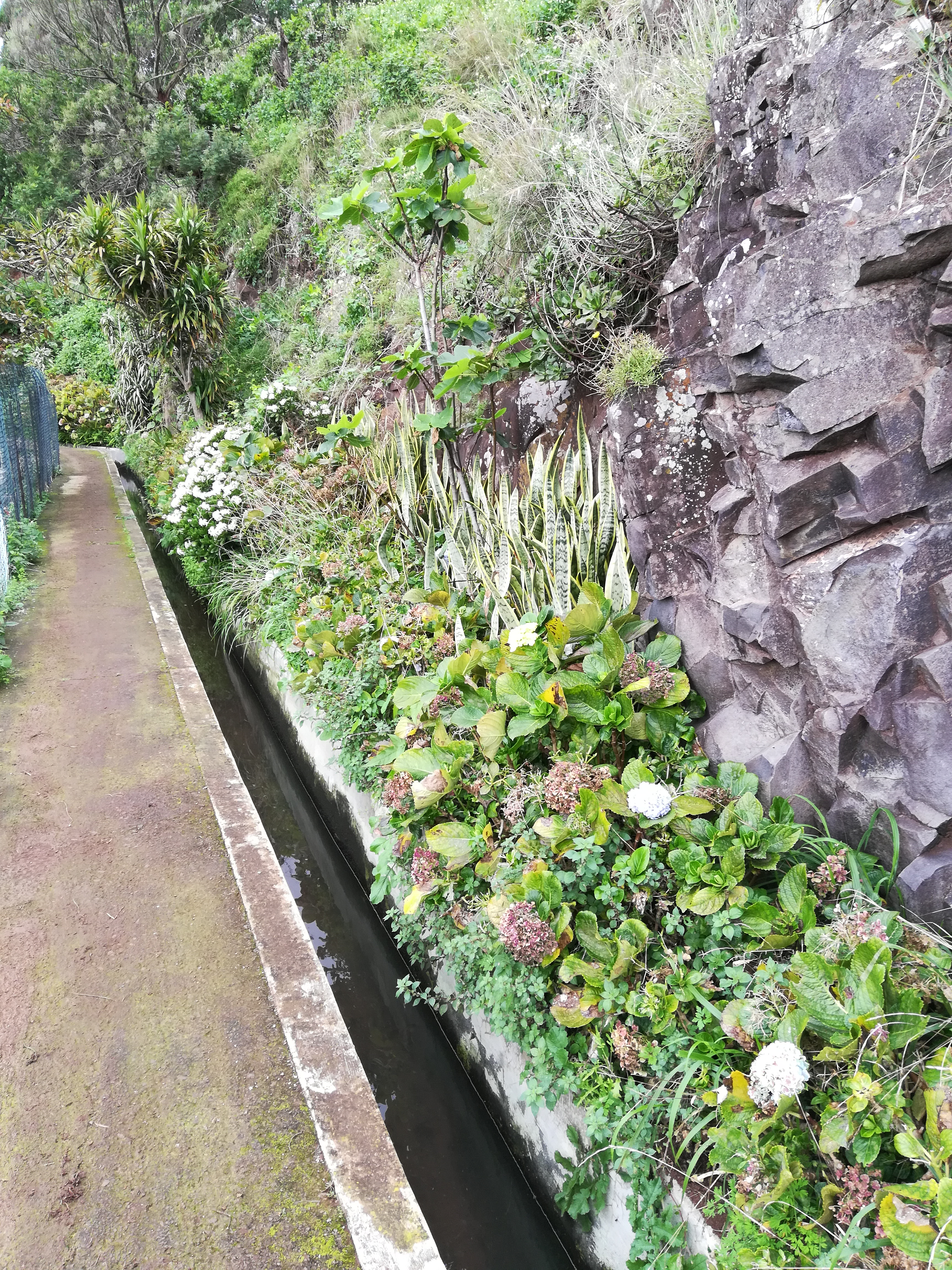 Nach einer Stunde fängt es auch hier an zu nieseln: Zeit, umzukehren. Ist aber okay, denn ich wollte ja nur einen Eindruck bekommen, wie ein anderer Weg sich gehen lässt. Auf dem Rückweg sieht alles nochmal ganz anders aus: man hat eher die Aussicht auf die Mündung des Flusses und das Meer. Das wäre ja die normale Gehrichtung: vor allem mit der Levada auf der linken Seite.