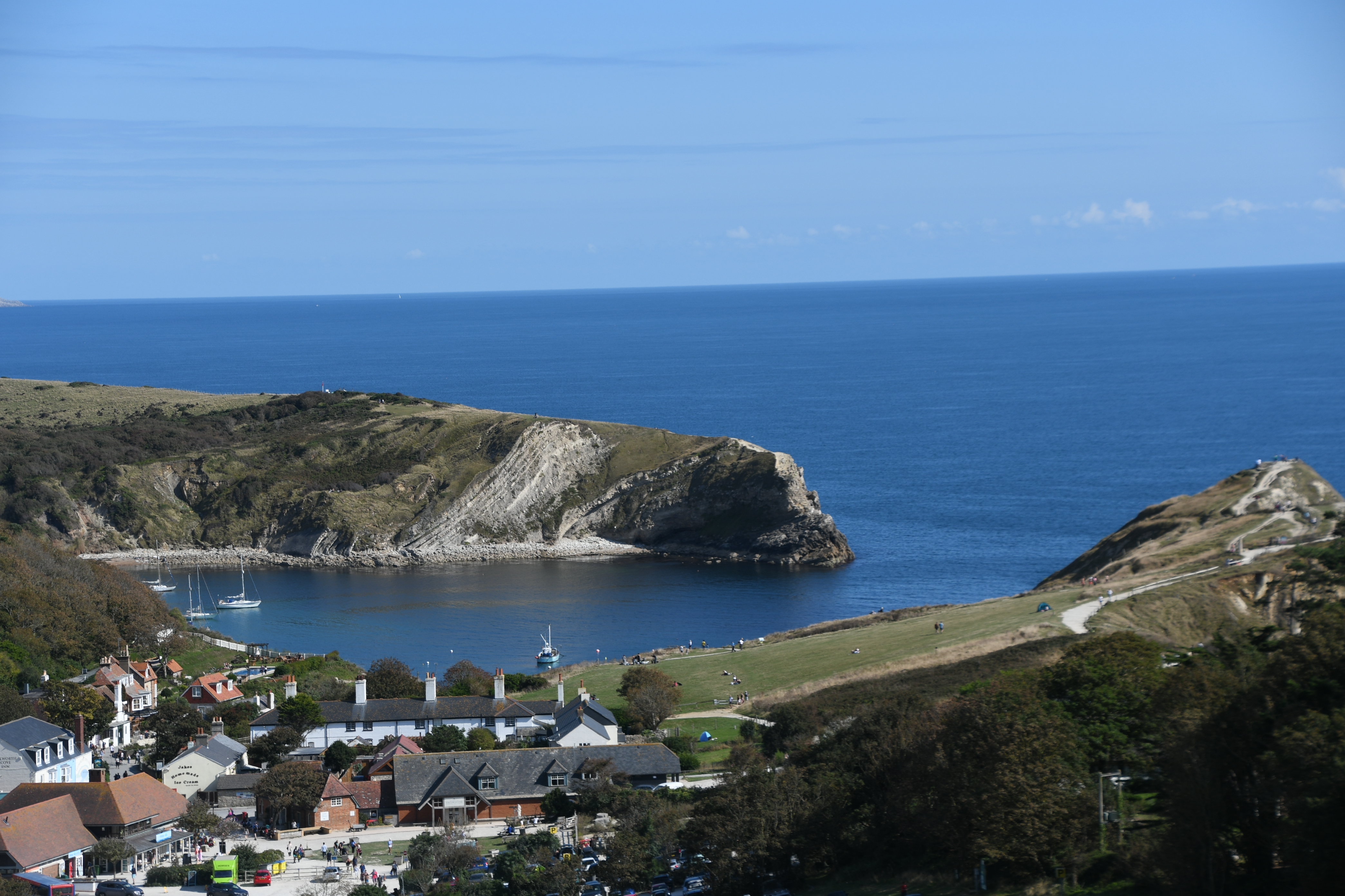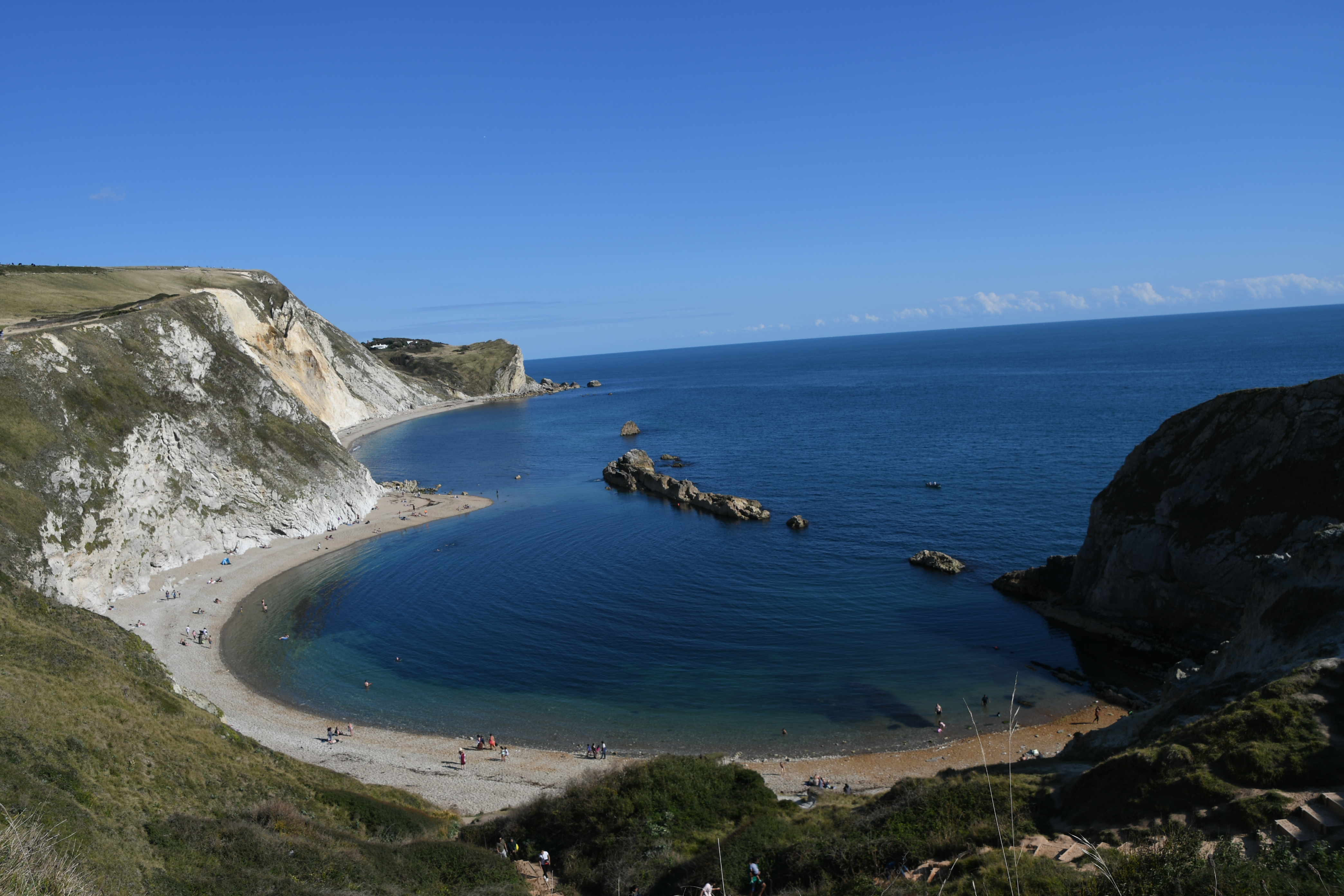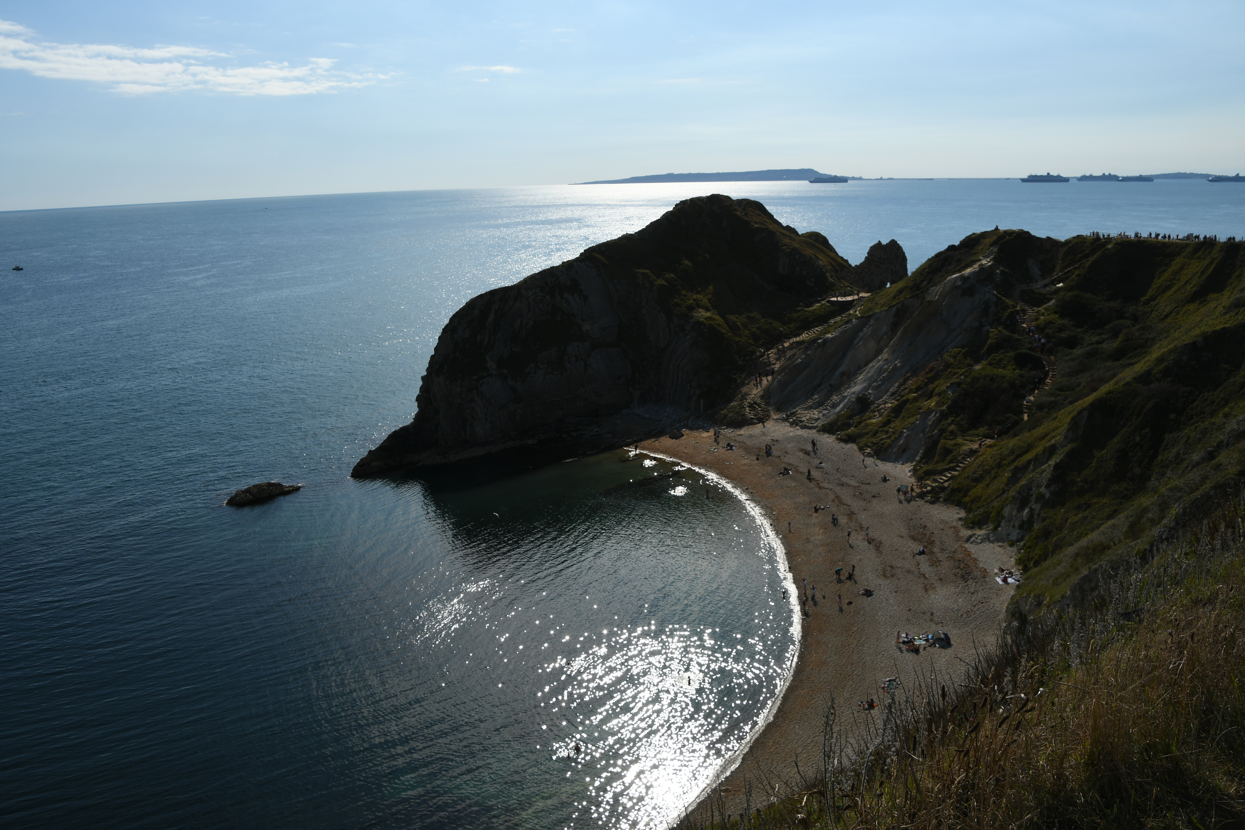 Ich fahre runter nach Lulworth Cove, parke das Auto, ziehe bei dem schönen Wetter tatsächlich meine Shorts an und mache mich auf den Weg. Erst die Bucht – diesmal von oben – und dann über den Hügel rüber zum: Durdle Door. Bei schönstem Wetter ! Ich freue mich riesig, denn genauso habe ich es mir gewünscht, nachdem das Wetter letztes Mal so greulich war.