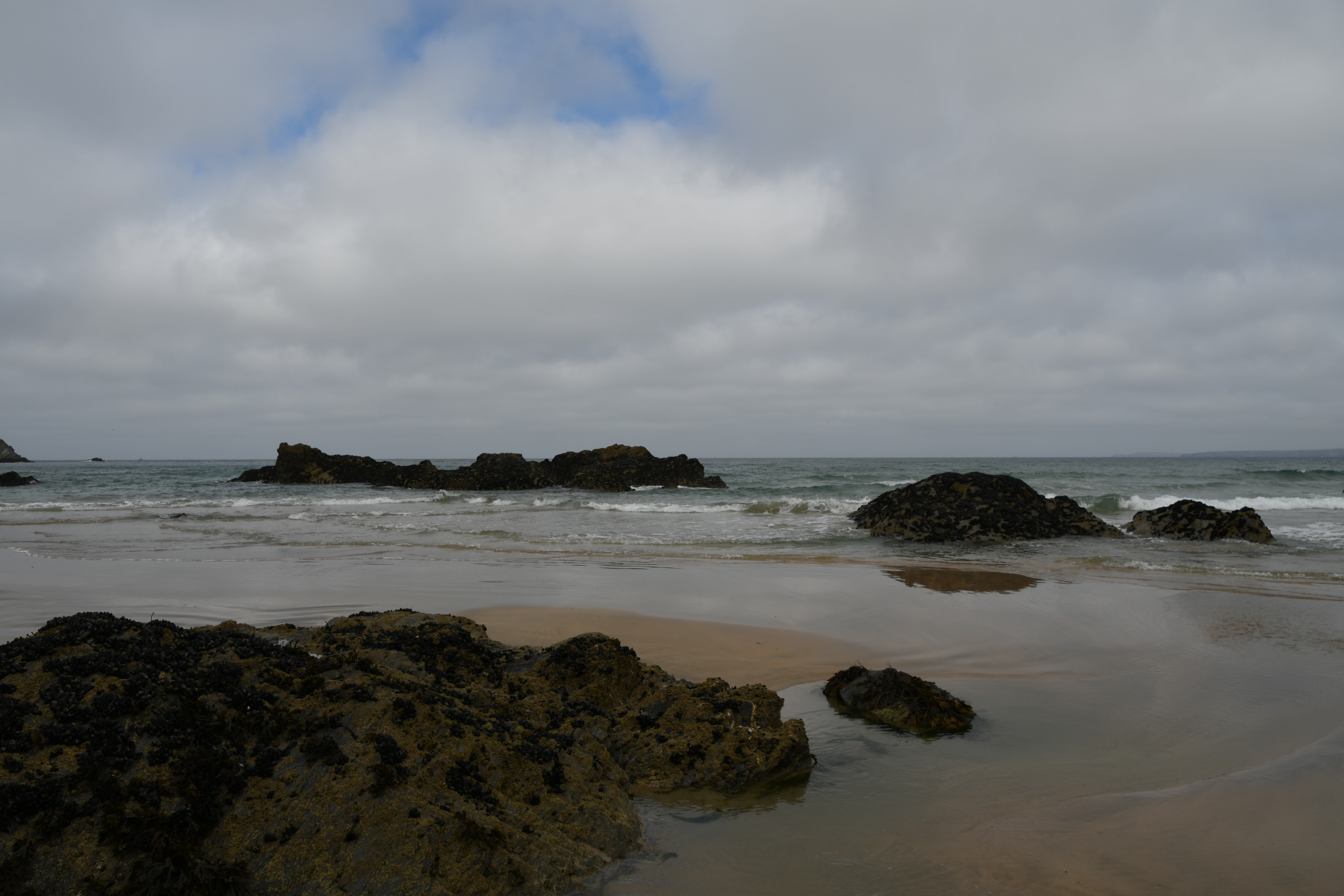 Ich schaue ein wenig dem Treiben auf den Wellen zu, genieße nach dem nächsten Felsen, um den man bei Ebbe auch rumlaufen kann, die Ruhe und setze mich sogar auf einen dieser sehr rauhen Brocken, die nichtmal glitschig sind.