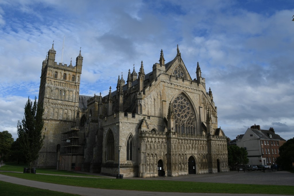 Weiter geht’s nach Exeter, der Hauptstadt der Region und bekannt für seine Kathedrale. Als ich dort ankomme, ist es kurz nach 16 Uhr. Eigentlich noch viel Zeit – aber leider macht genau jetzt die Kathedrale zu… Also gibt’s nur Fotos von außen – wenigstens zeigt sich jetzt die Sonne ein bisschen – und Exeter kommt fürs nächste Mal wieder auf die Liste. Die Stadt selbst ist sehr schön. Mit alten Fachwerkhäusern, Teilen der alten Stadtmauer zwischen modernen Geschäften in der Fußgängerzone, schönen Parks. Eine Stadt mit Flair – und endlich ein Ort, den ich von meinen Filmen wirklich wiedererkenne: die Wiese vor der Kathedrale. Dort setze ich mich auf eine Bank und lasse die Eindrücke noch einmal auf mich wirken, während ich mir mein Sandwich schmecken lasse.