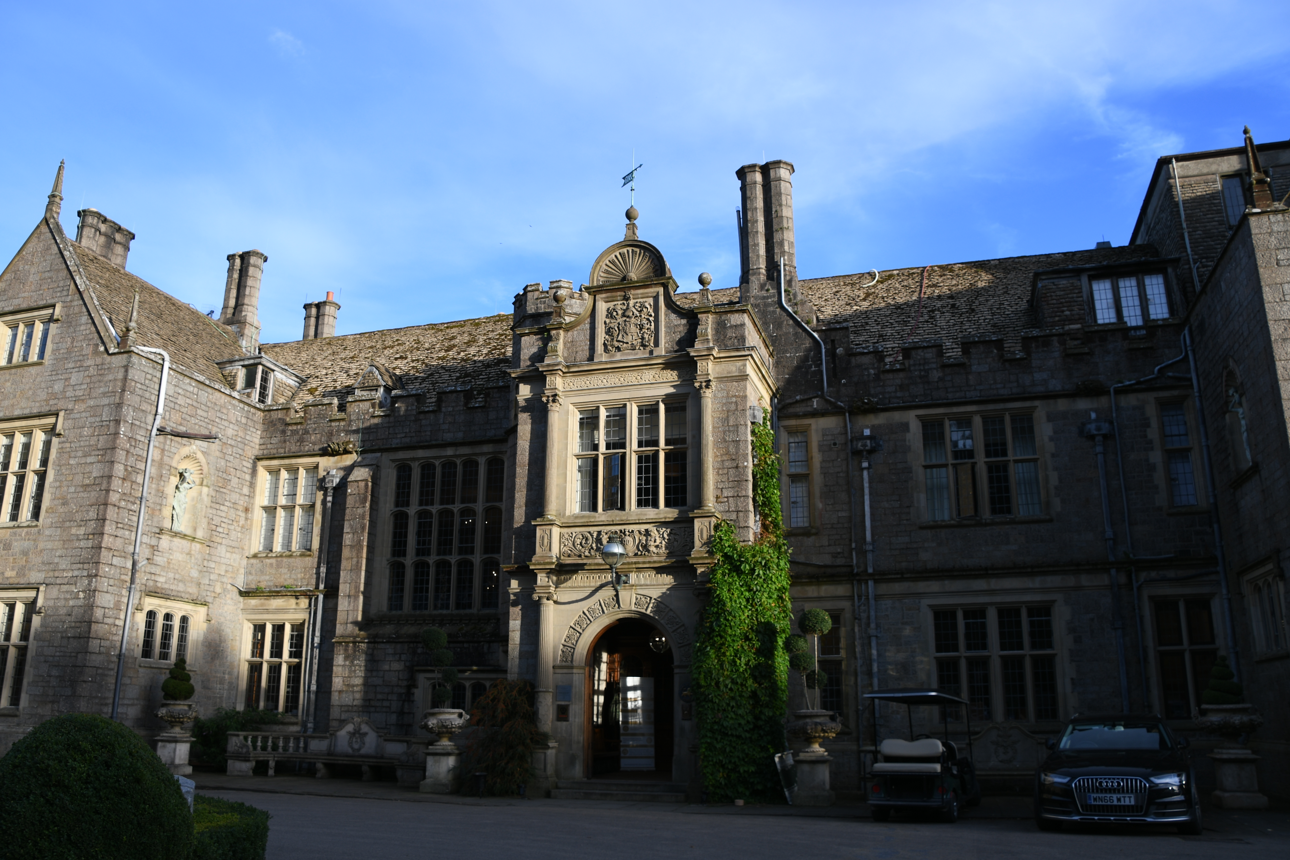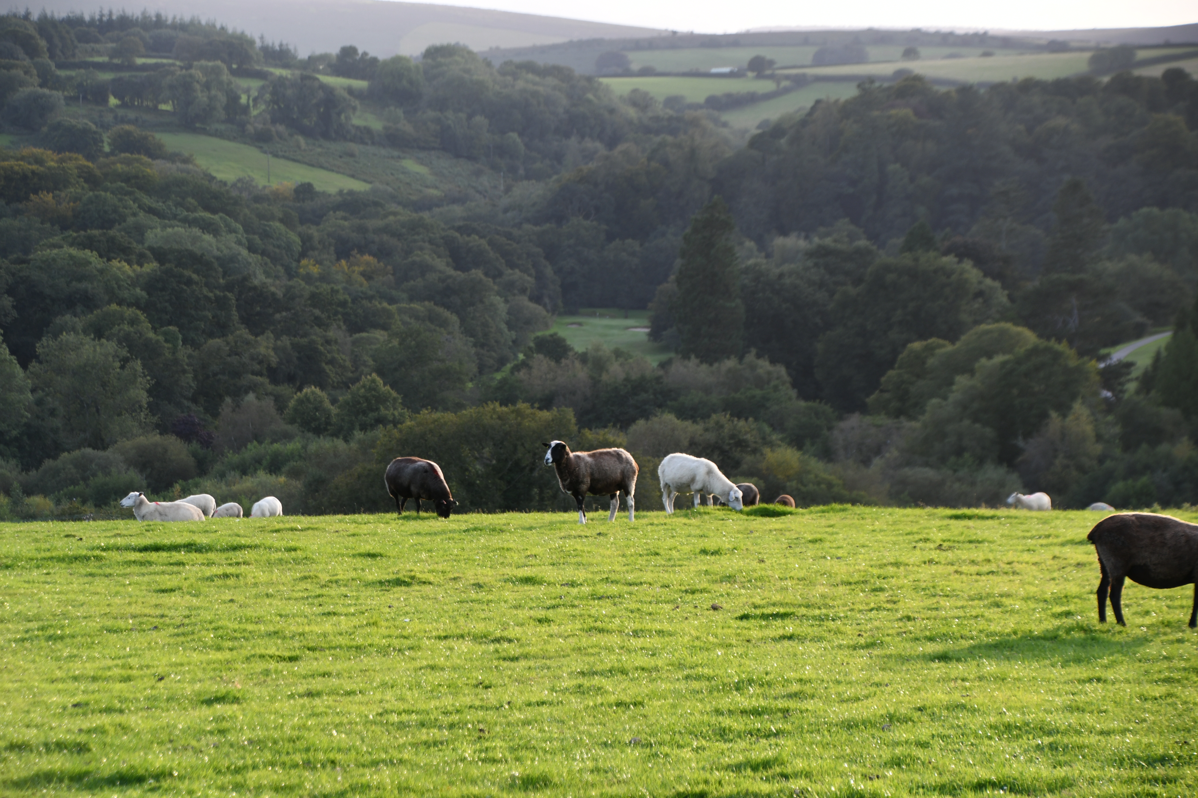 Für den Heimweg habe ich mir auf der Karte eine „grüne Strecke“ ausgesucht: besonders typisch für die Region. Das ist sie wirklich. Immer wieder komme ich durch diese tunnelartig geschnittenen Alleen und schmalen Straßen, durch die nur ein Auto passt. Da heißt es echt aufpassen. Bis ich zur Einfahrt von Bovey Castle komme. „Castle“ – da muss ich rein. Scheint mir ein Hotel zu sein – und da steht nicht, dass ich da nicht rein darf… Also bahne ich mir meinen Weg durch Golfwiesen bis zum Haupthaus, das wirklich aussieht, wie ein Schloss – sehr schön ! Und durch den Hinterausgang entwische ich, ohne dass mich jemand aufhält – ein bisschen Abenteuer muss sein. Das eigentliche Abenteuer beginnt aber jetzt: Die Straßen sind noch kleiner und immer wieder kommen mir Einheimische entgegen, die aber freiwillig in die nächste Lücke zurückstoßen – vielleicht, weil ich eine Frau bin ! Nach einer halben Stunde mitten durch die Prärie, komme ich endlich wieder zurück auf meine eigentliche Route und bin dann auch sehr schnell wieder zurück in Torquay.