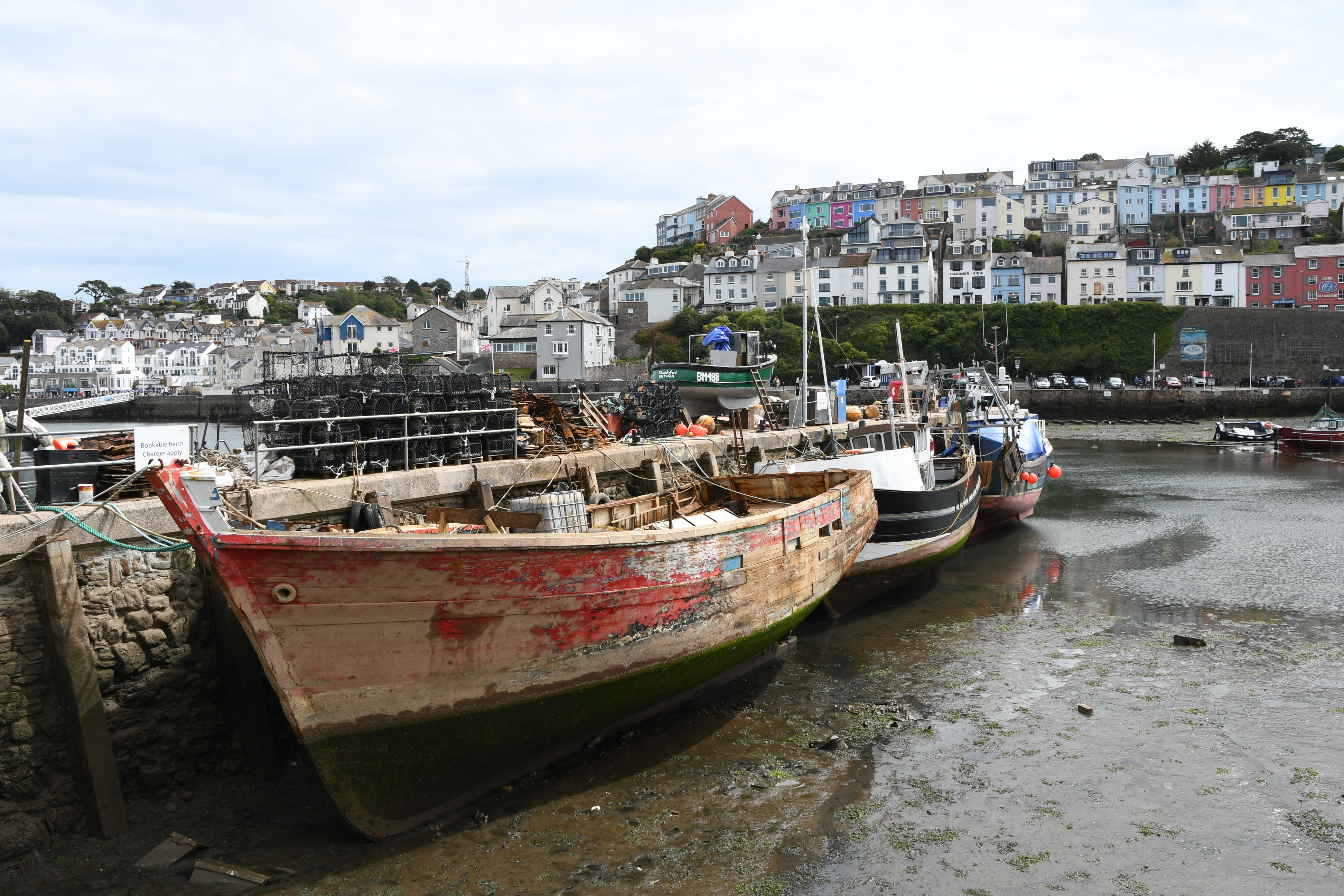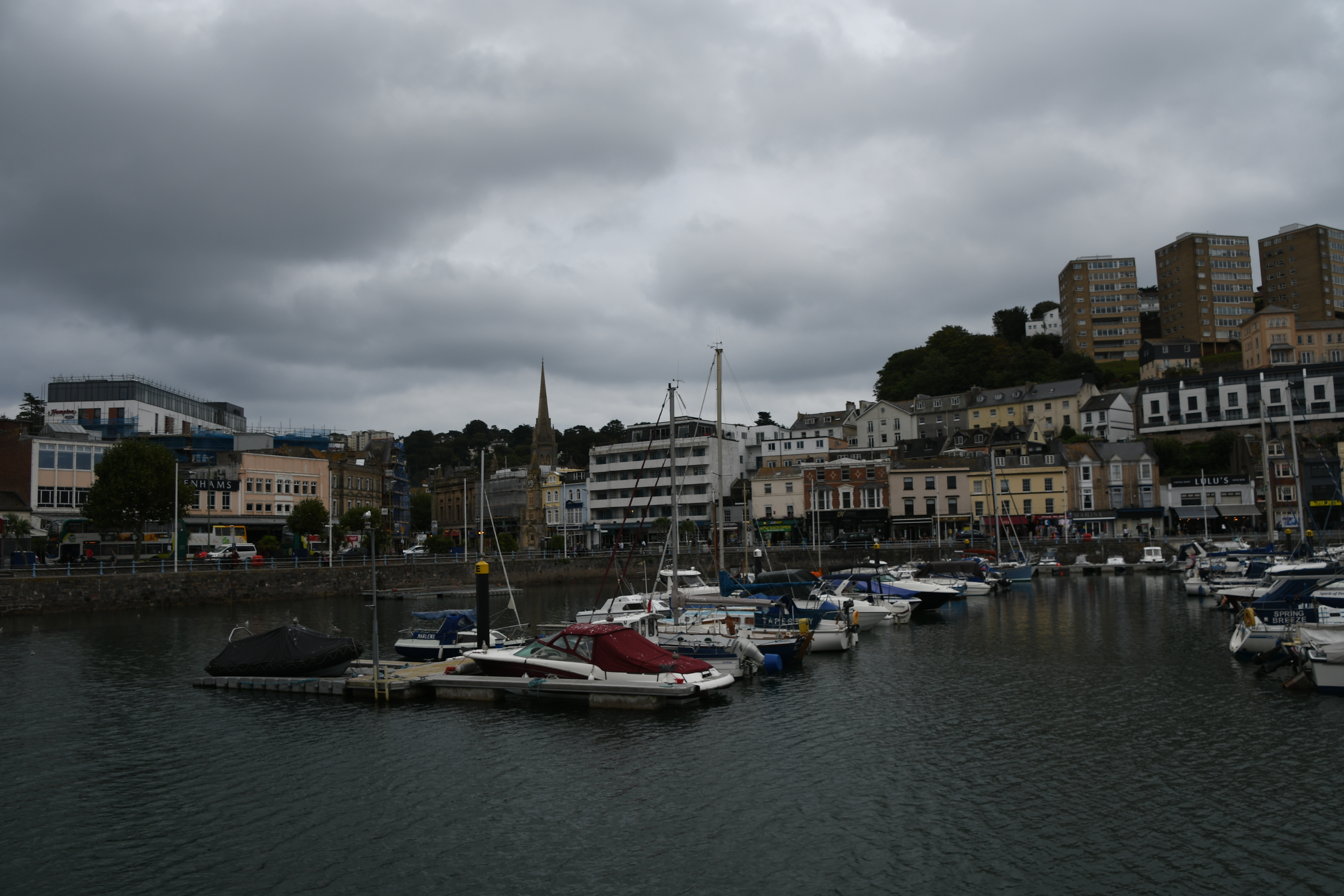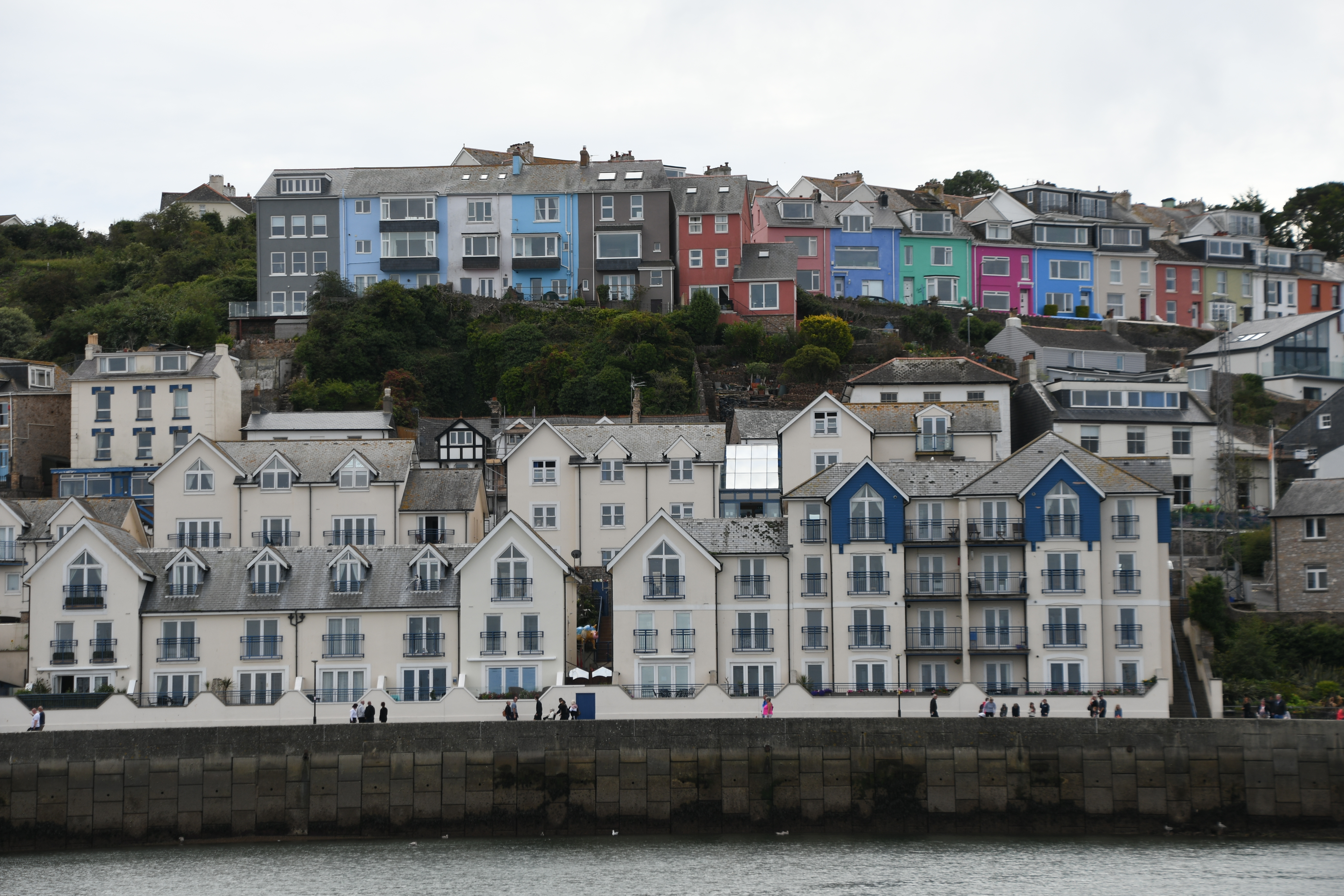 Wunderbar genährt und mit bereits einigen Bildern von wunderschönen Fassaden versorgt, mache ich mich auf den Weg zum Hafen, um nach der nächsten Fähre nach Brixham zu schauen – damit ich zumindest diesen Punkt von meiner Liste streichen kann. Und Schiffchen fahren ist immer gut ! Schon um 12 Uhr geht es los. Mit ein bisschen Nieselregen und wieder mit wunderbaren Anekdoten rund um die Bucht und die Orte Torquay (Geburtsstadt von Agatha Christie), Peignton mit seinen Strandhütten und natürlich Brixham. Auf dem Weg passieren wir einen dänischen 3-Master, der in der Bucht übernachtet hat. Und aus dem Augenwinkel sehe ich in der Ferne ein Cunard-Schiff (später stellt sich heraus, dass das die Queen Mary II ist, die in der nächsten Bucht liegt).