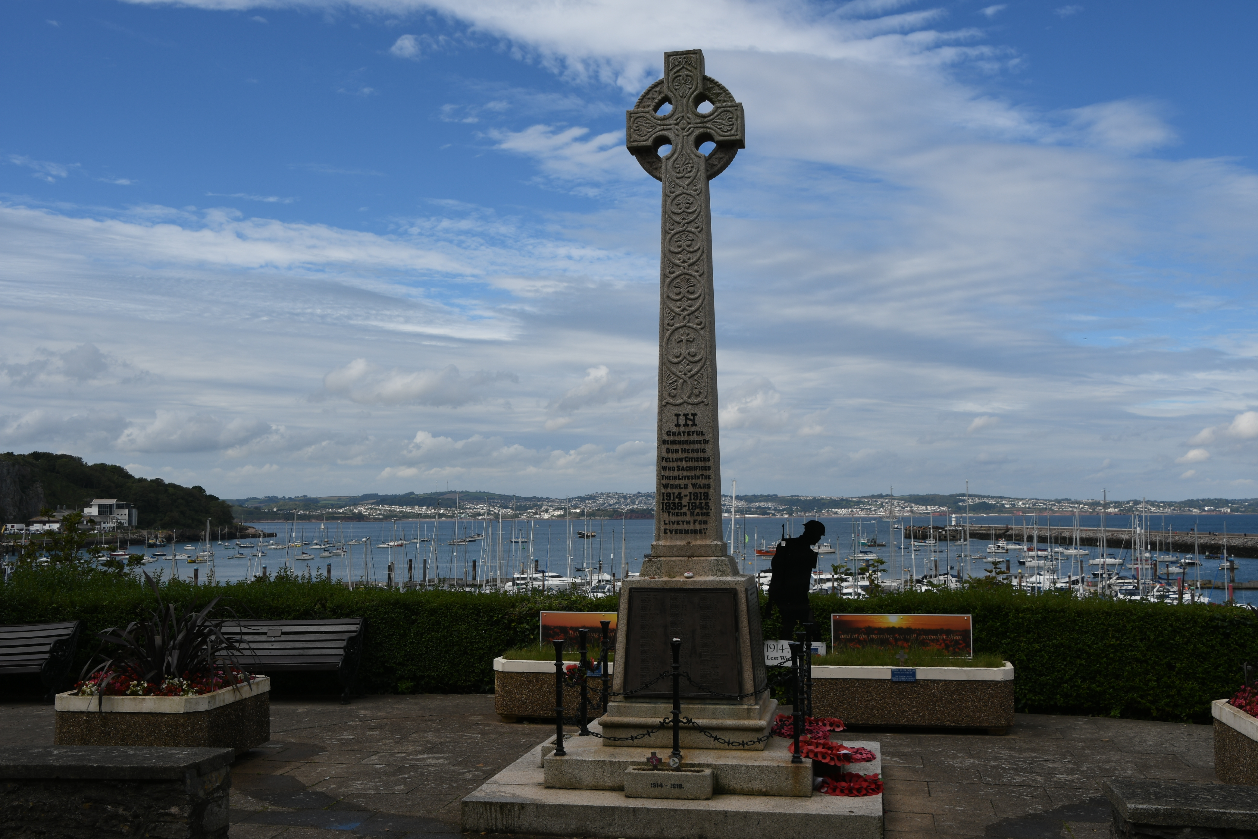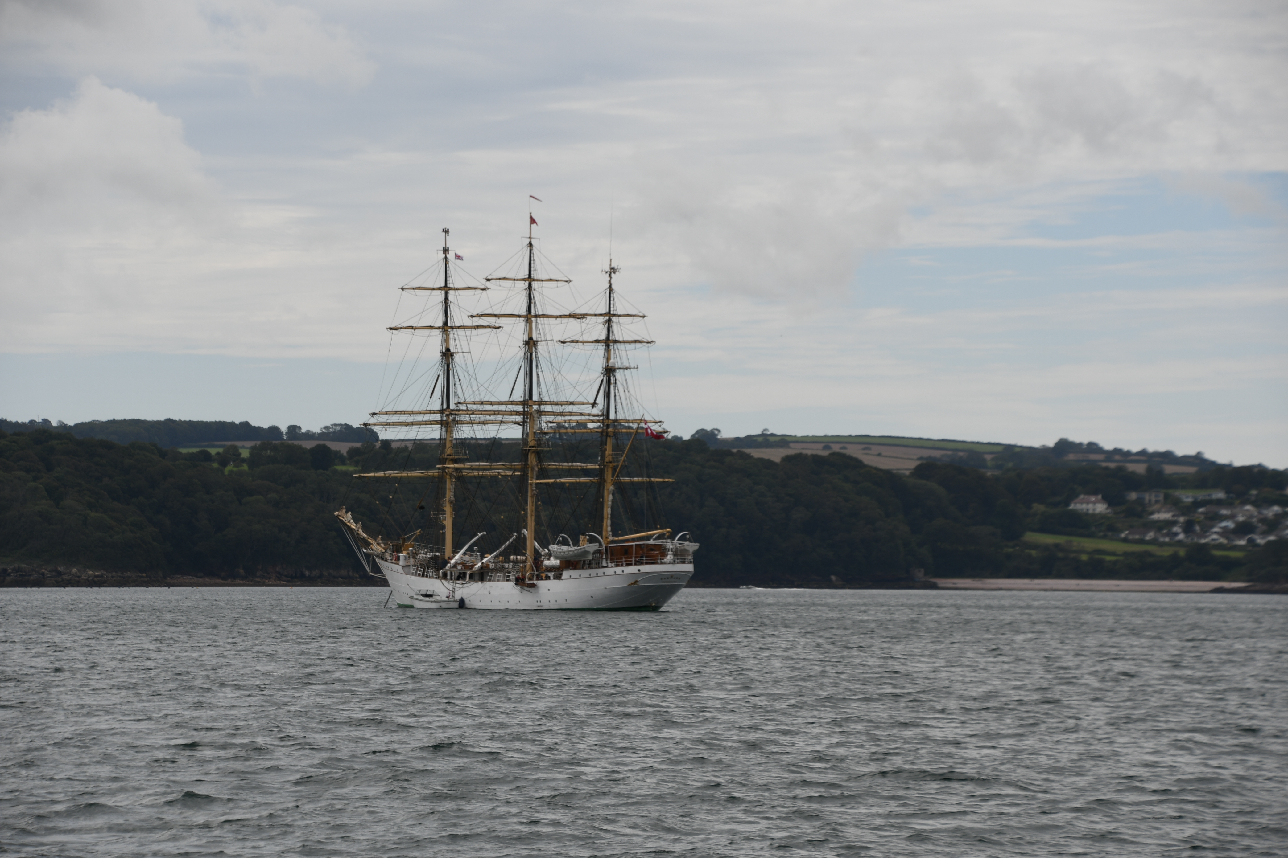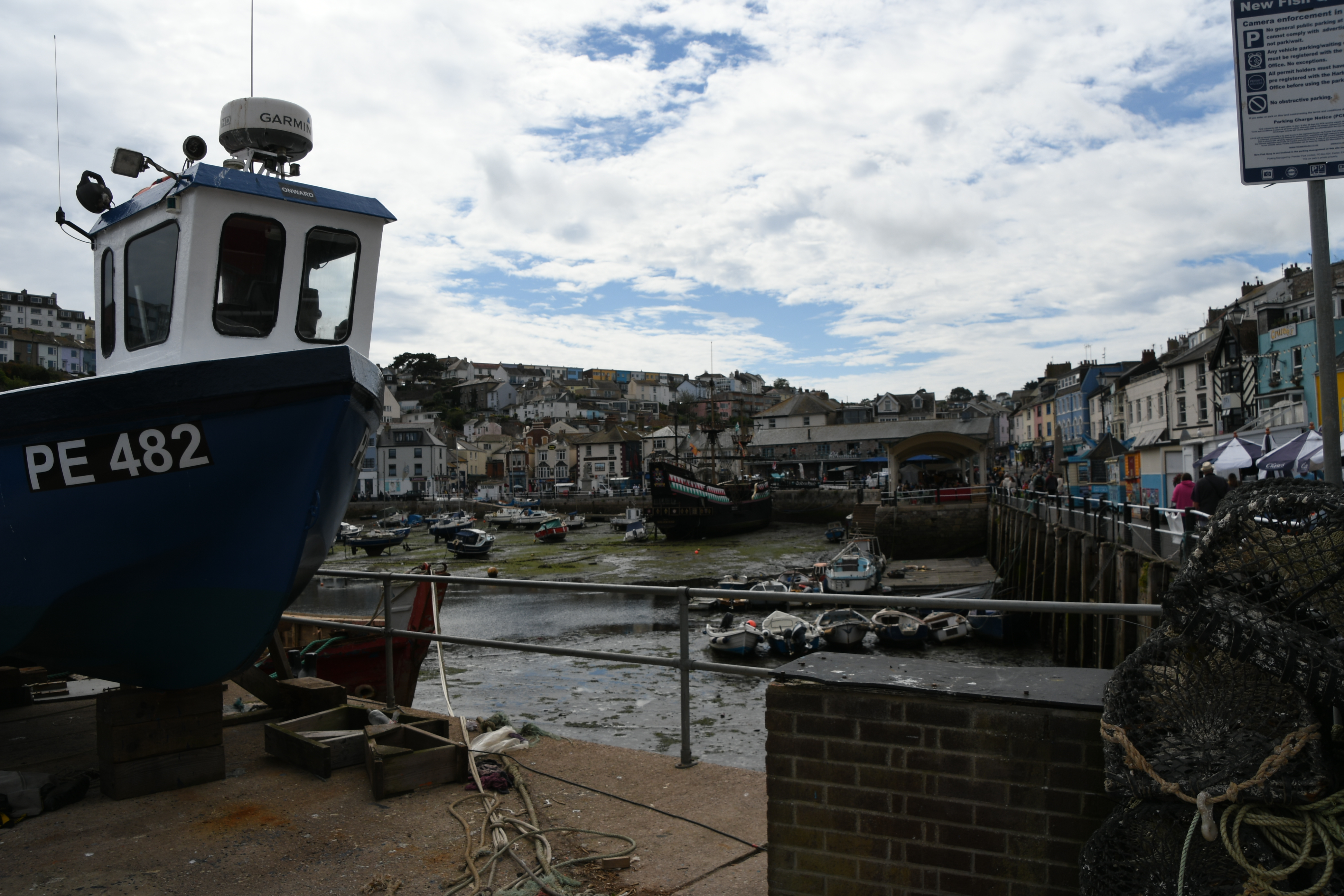 Wunderbar genährt und mit bereits einigen Bildern von wunderschönen Fassaden versorgt, mache ich mich auf den Weg zum Hafen, um nach der nächsten Fähre nach Brixham zu schauen – damit ich zumindest diesen Punkt von meiner Liste streichen kann. Und Schiffchen fahren ist immer gut ! Schon um 12 Uhr geht es los. Mit ein bisschen Nieselregen und wieder mit wunderbaren Anekdoten rund um die Bucht und die Orte Torquay (Geburtsstadt von Agatha Christie), Peignton mit seinen Strandhütten und natürlich Brixham. Auf dem Weg passieren wir einen dänischen 3-Master, der in der Bucht übernachtet hat. Und aus dem Augenwinkel sehe ich in der Ferne ein Cunard-Schiff (später stellt sich heraus, dass das die Queen Mary II ist, die in der nächsten Bucht liegt).