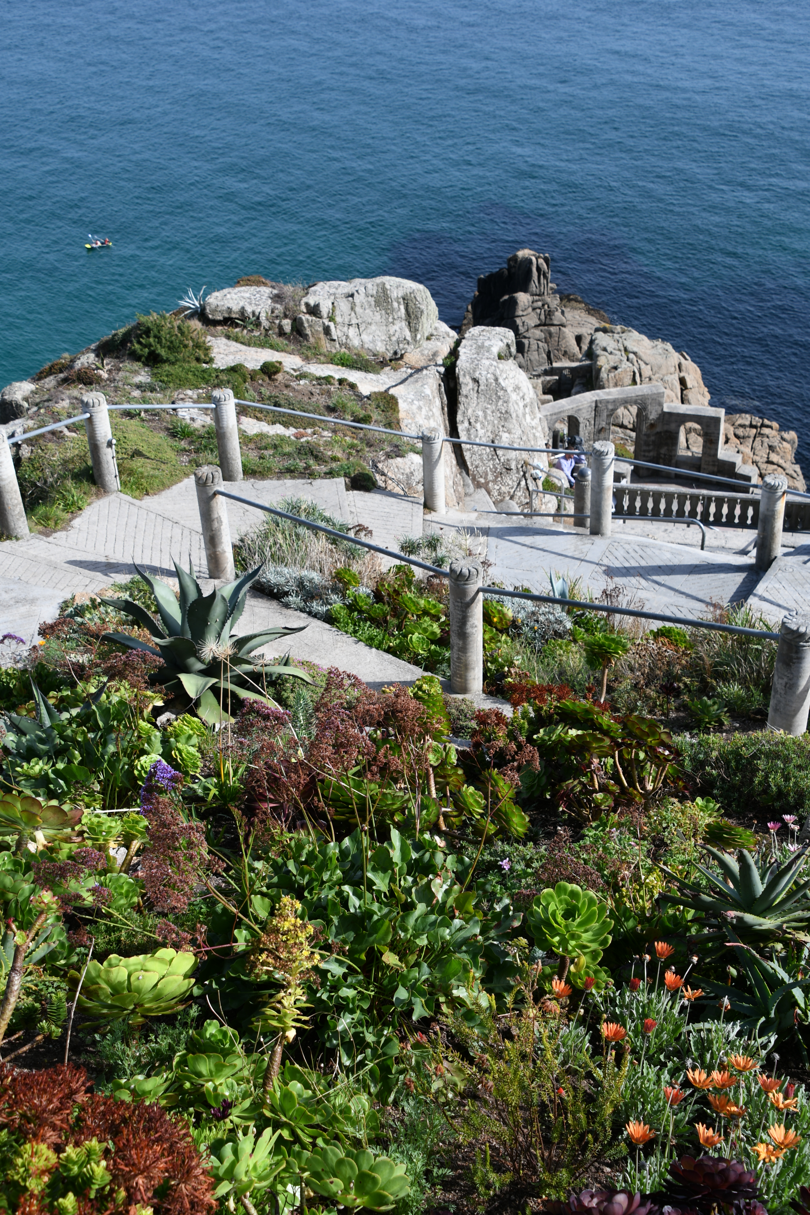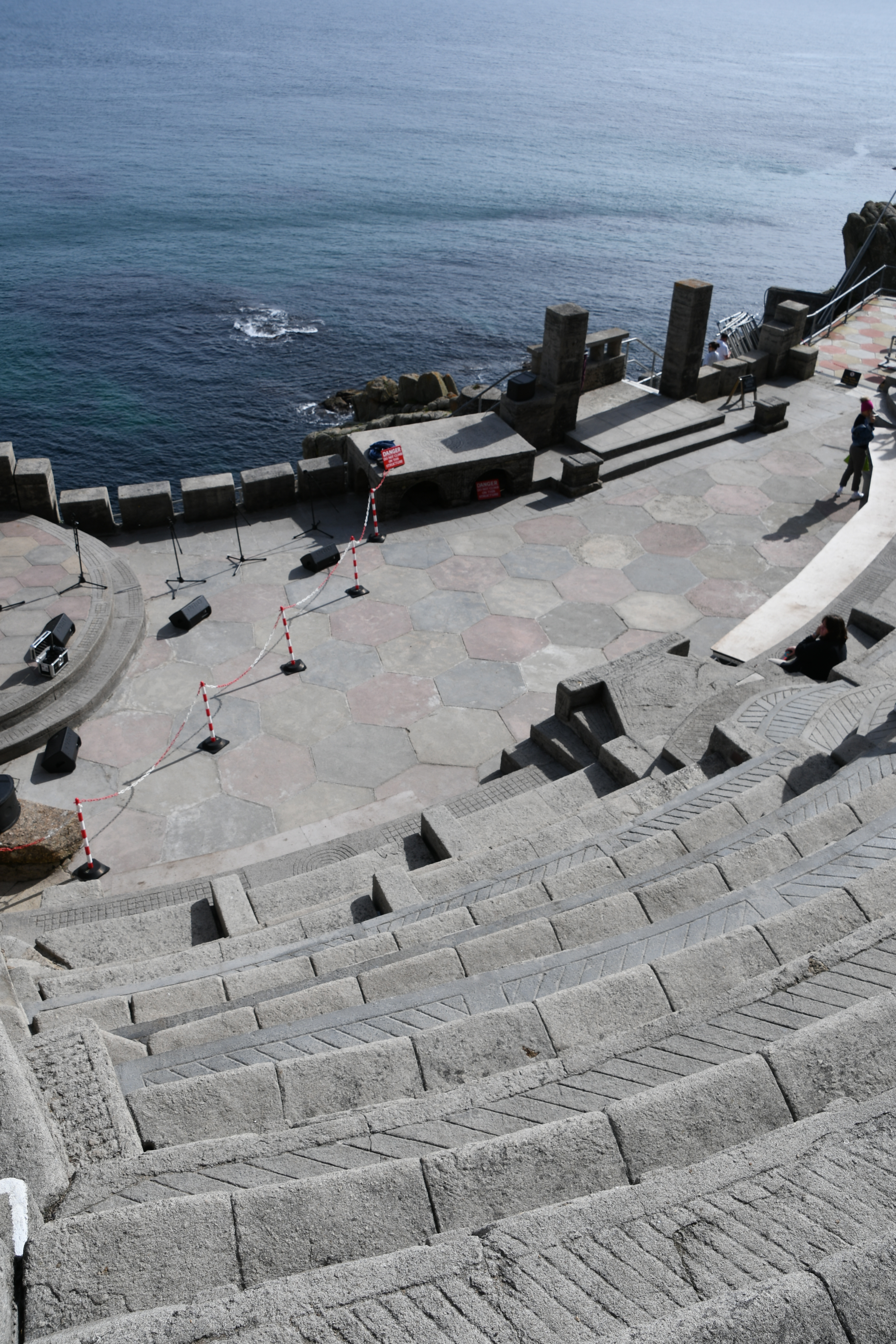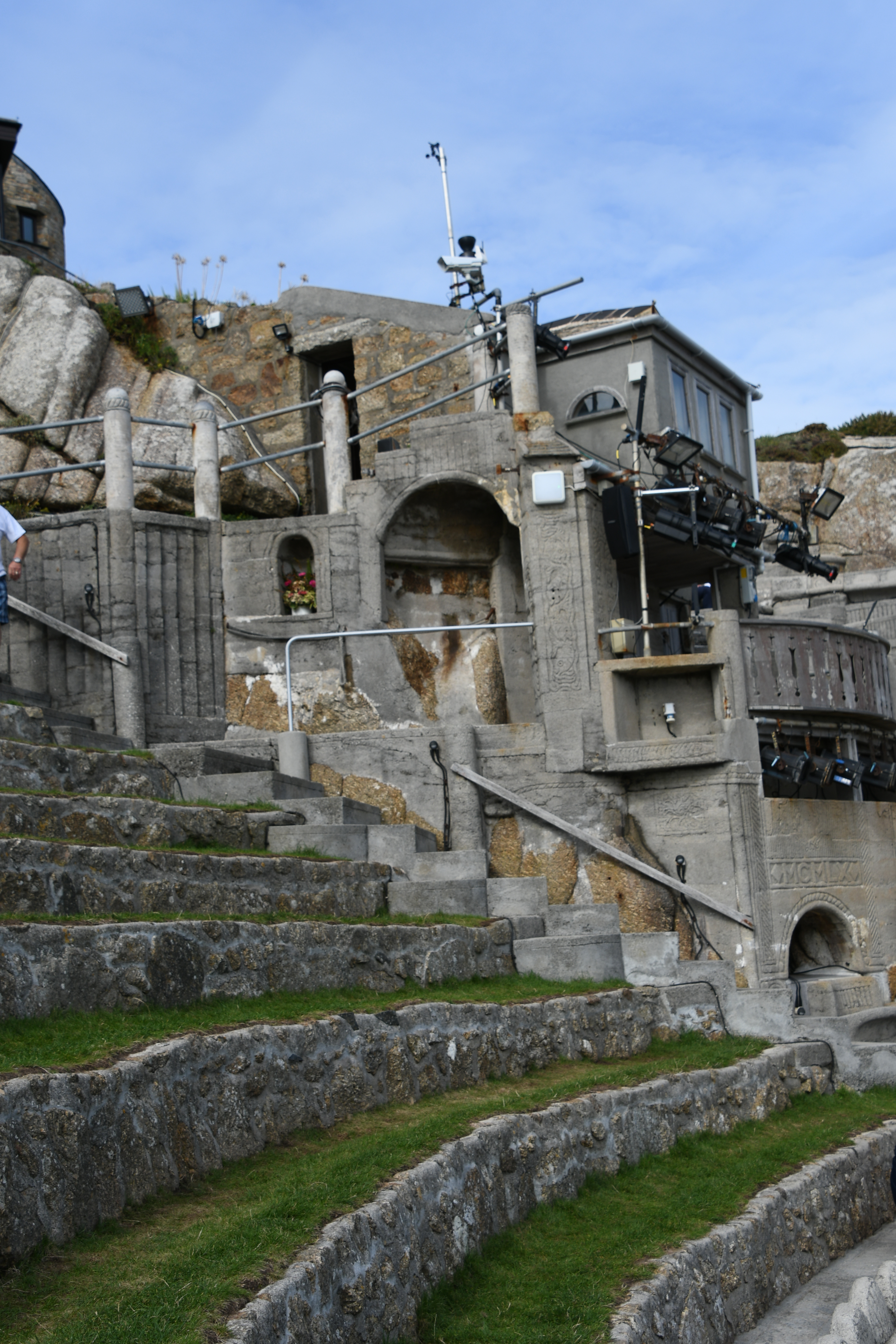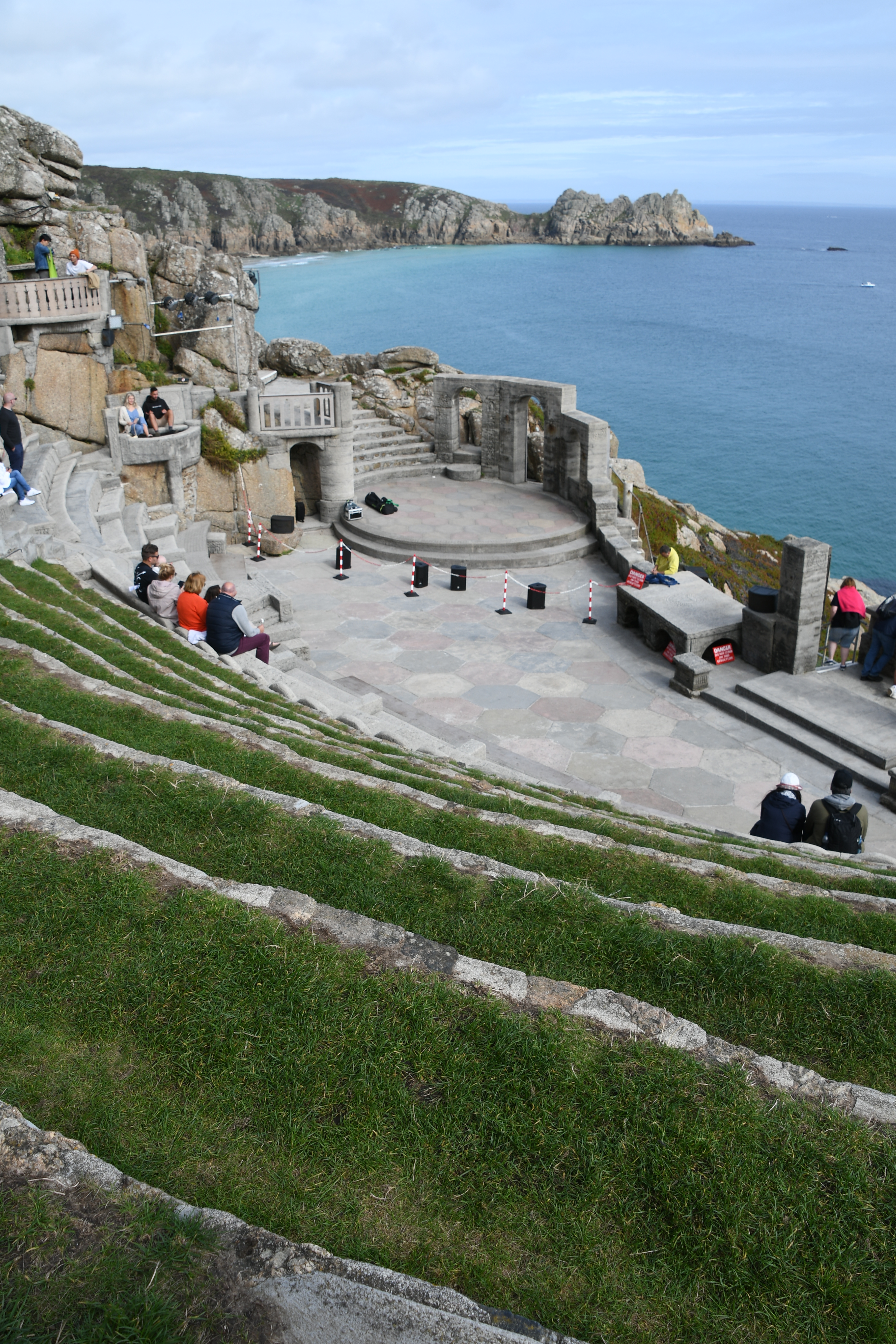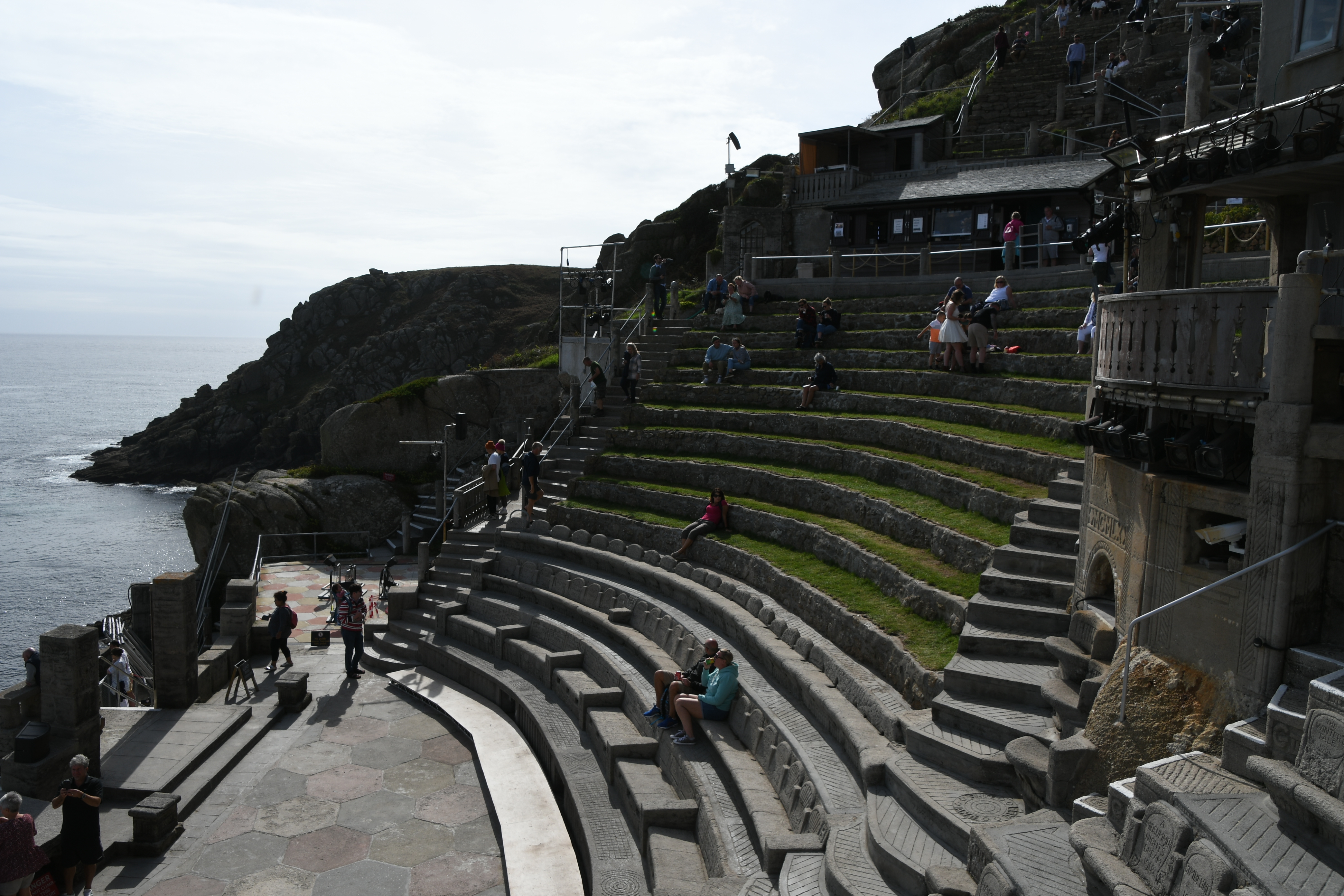 Langsam wird es aber Zeit, mich zu meinem heutigen Höhepunkt aufzumachen: Um 15 Uhr hab ich einen Termin im Minack Theatre: In die Felsen gebaut mit wunderschöner Bepflanzung, fertiggestellt 1960 mit einer traumhaften Aussicht. Jetzt kommt sogar die Sonne heraus und so kann ich meinen Capuccino auf den Grasstufen des Theaters sitzend genießen und stelle mir vor, wie da unten eine Veranstaltung stattfindet. Noch etwas für meine To-Do-Liste… Für dieses Mal begnüge ich mich damit, auf den Bänken herumzuklettern und den Technikern dabei zuzuschauen, wie sie die Veranstaltung für heute Abend vorbereiten.