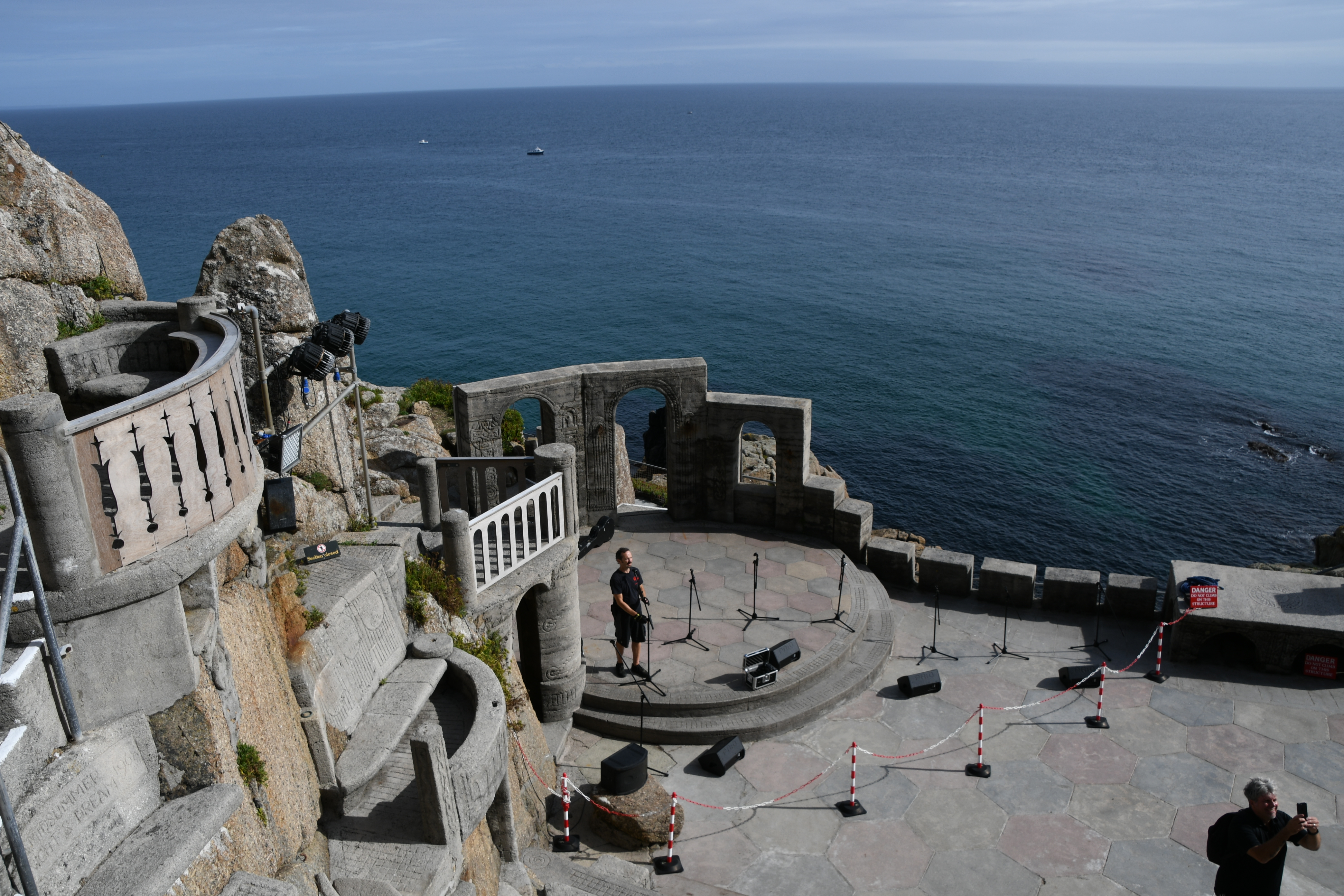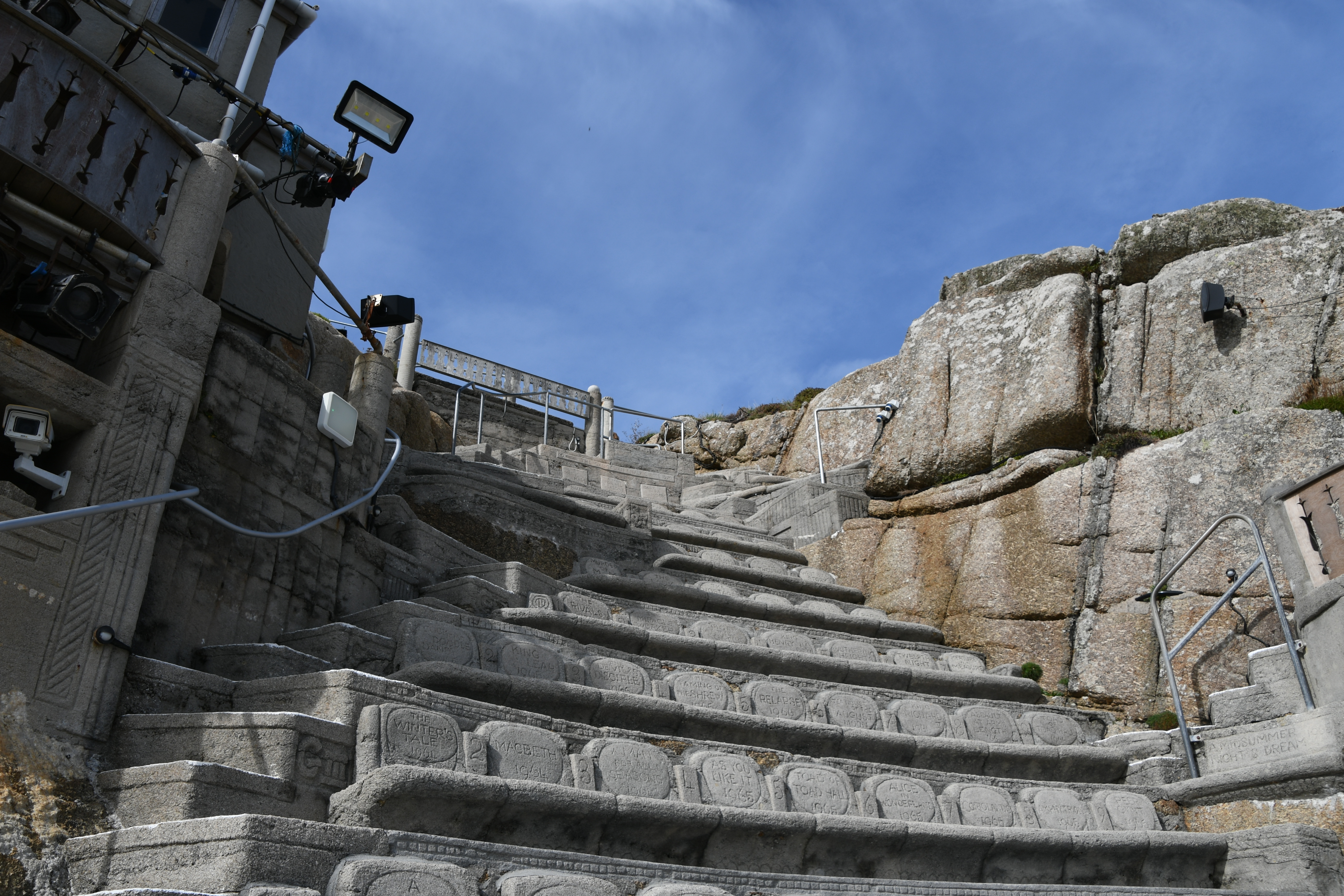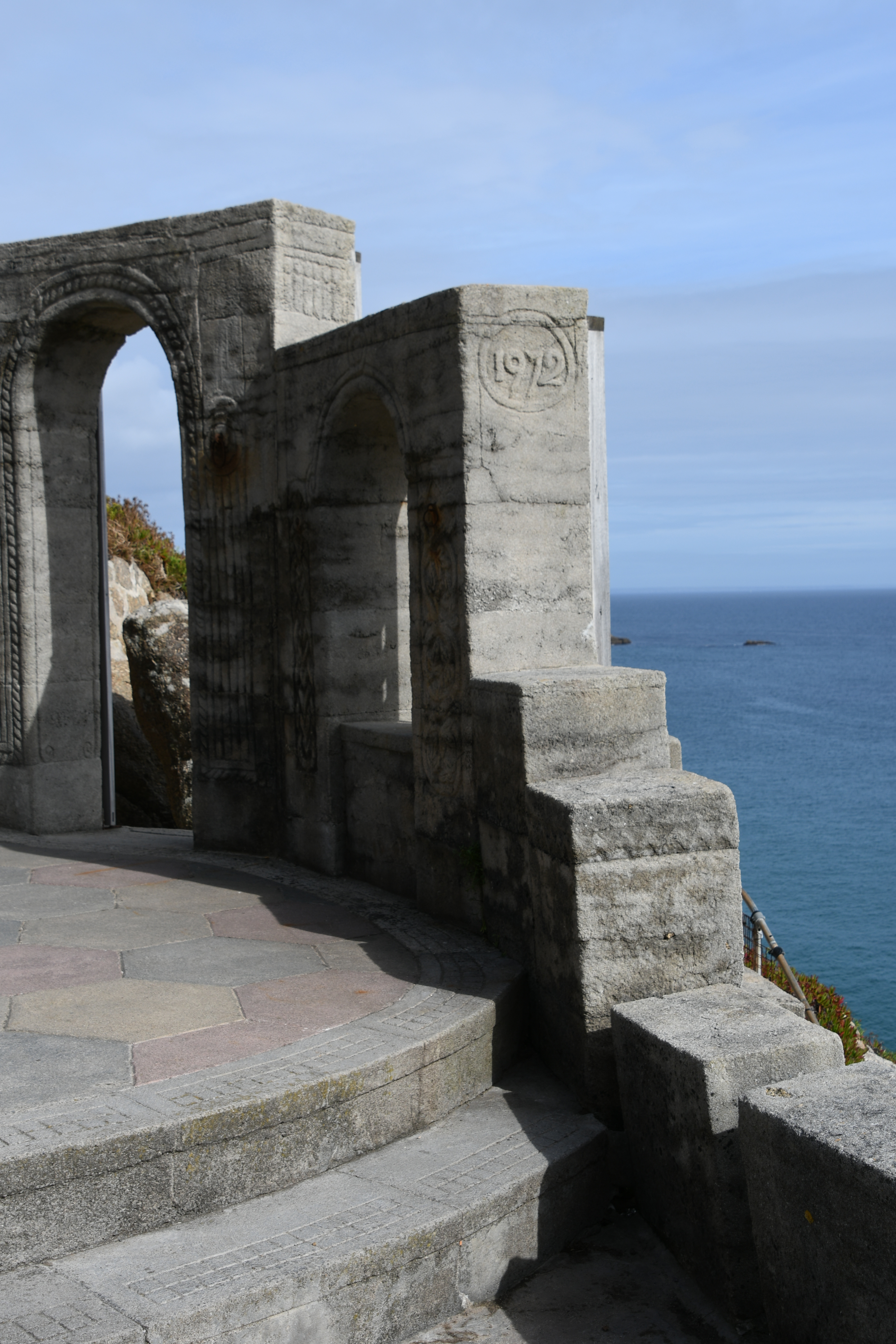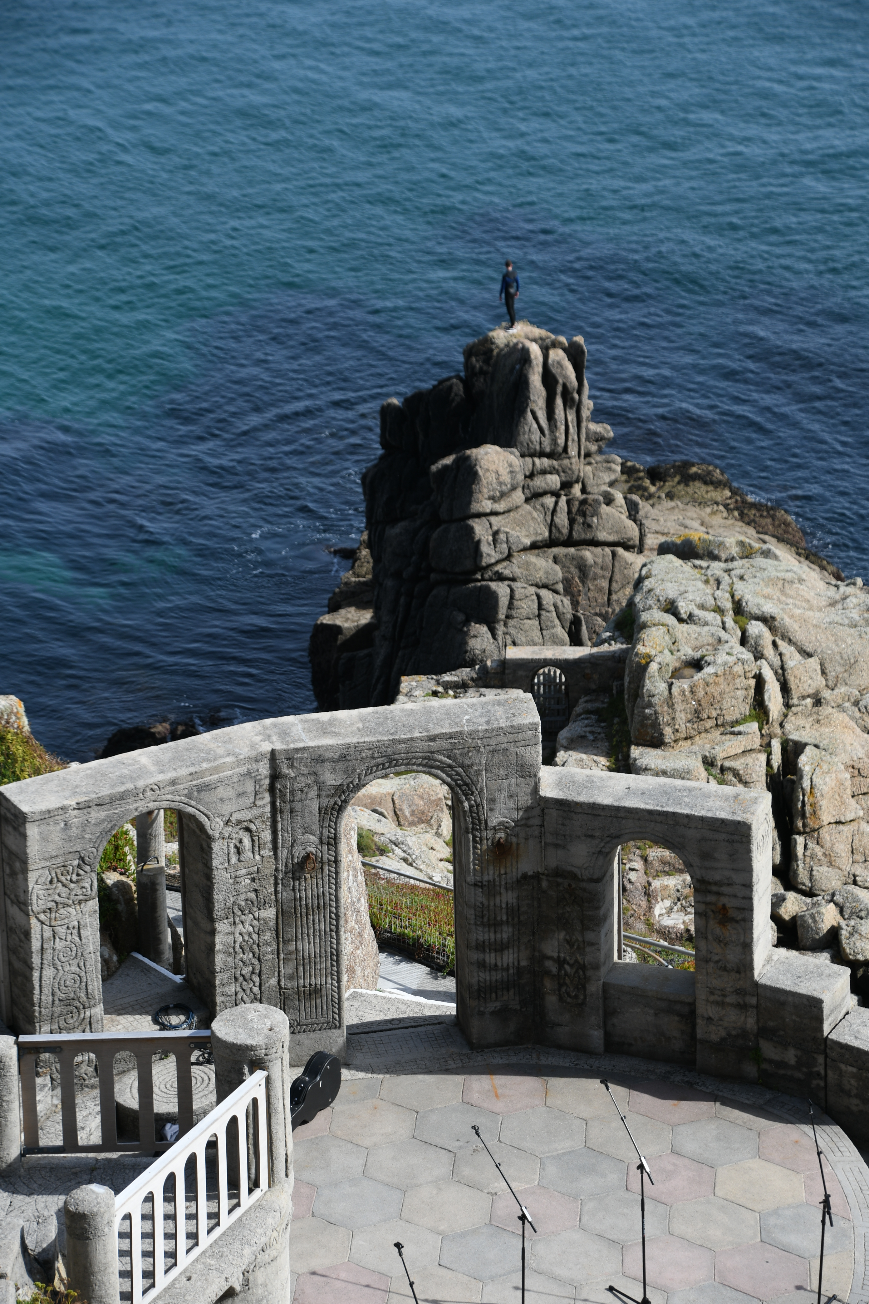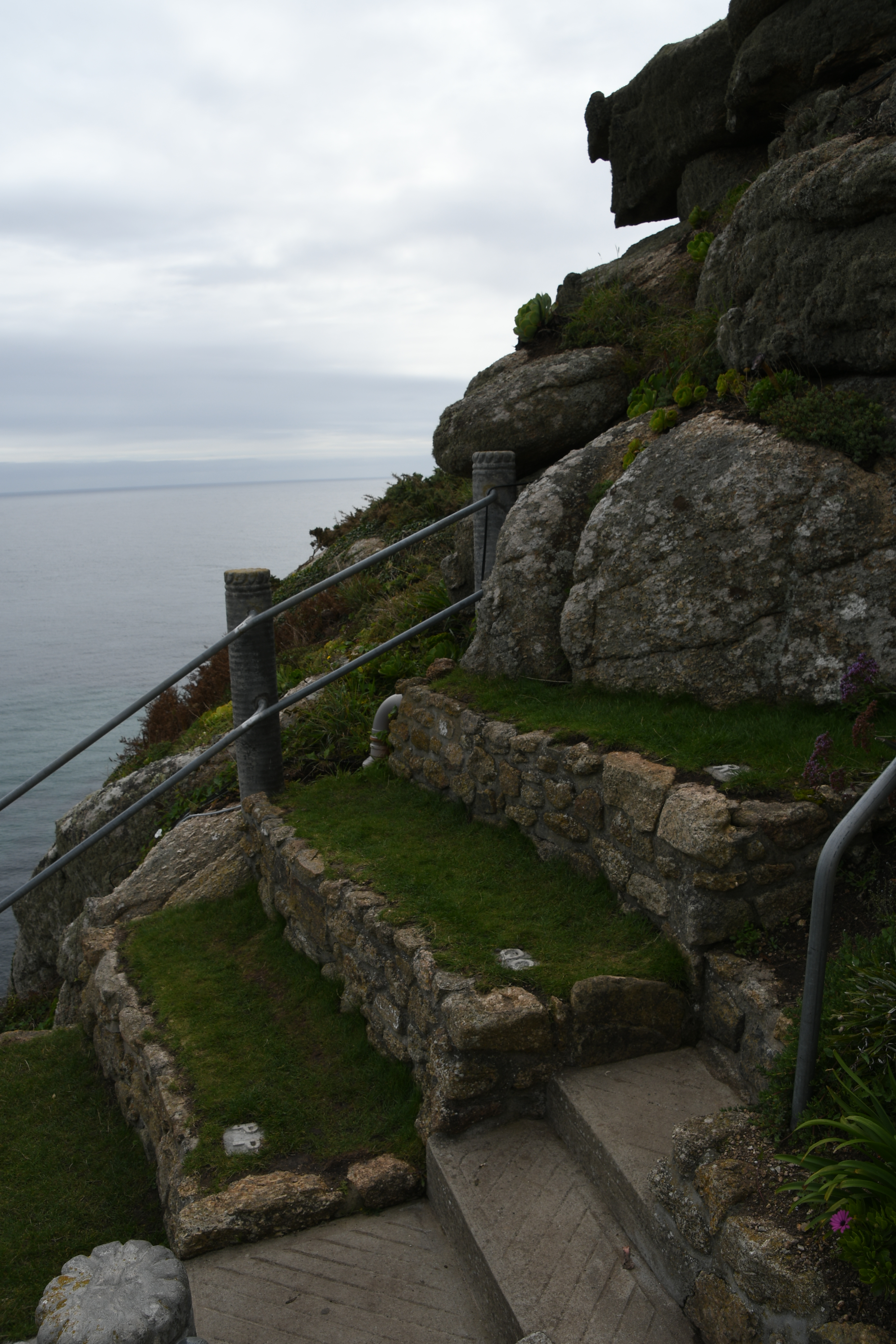 Langsam wird es aber Zeit, mich zu meinem heutigen Höhepunkt aufzumachen: Um 15 Uhr hab ich einen Termin im Minack Theatre: In die Felsen gebaut mit wunderschöner Bepflanzung, fertiggestellt 1960 mit einer traumhaften Aussicht. Jetzt kommt sogar die Sonne heraus und so kann ich meinen Capuccino auf den Grasstufen des Theaters sitzend genießen und stelle mir vor, wie da unten eine Veranstaltung stattfindet. Noch etwas für meine To-Do-Liste… Für dieses Mal begnüge ich mich damit, auf den Bänken herumzuklettern und den Technikern dabei zuzuschauen, wie sie die Veranstaltung für heute Abend vorbereiten.